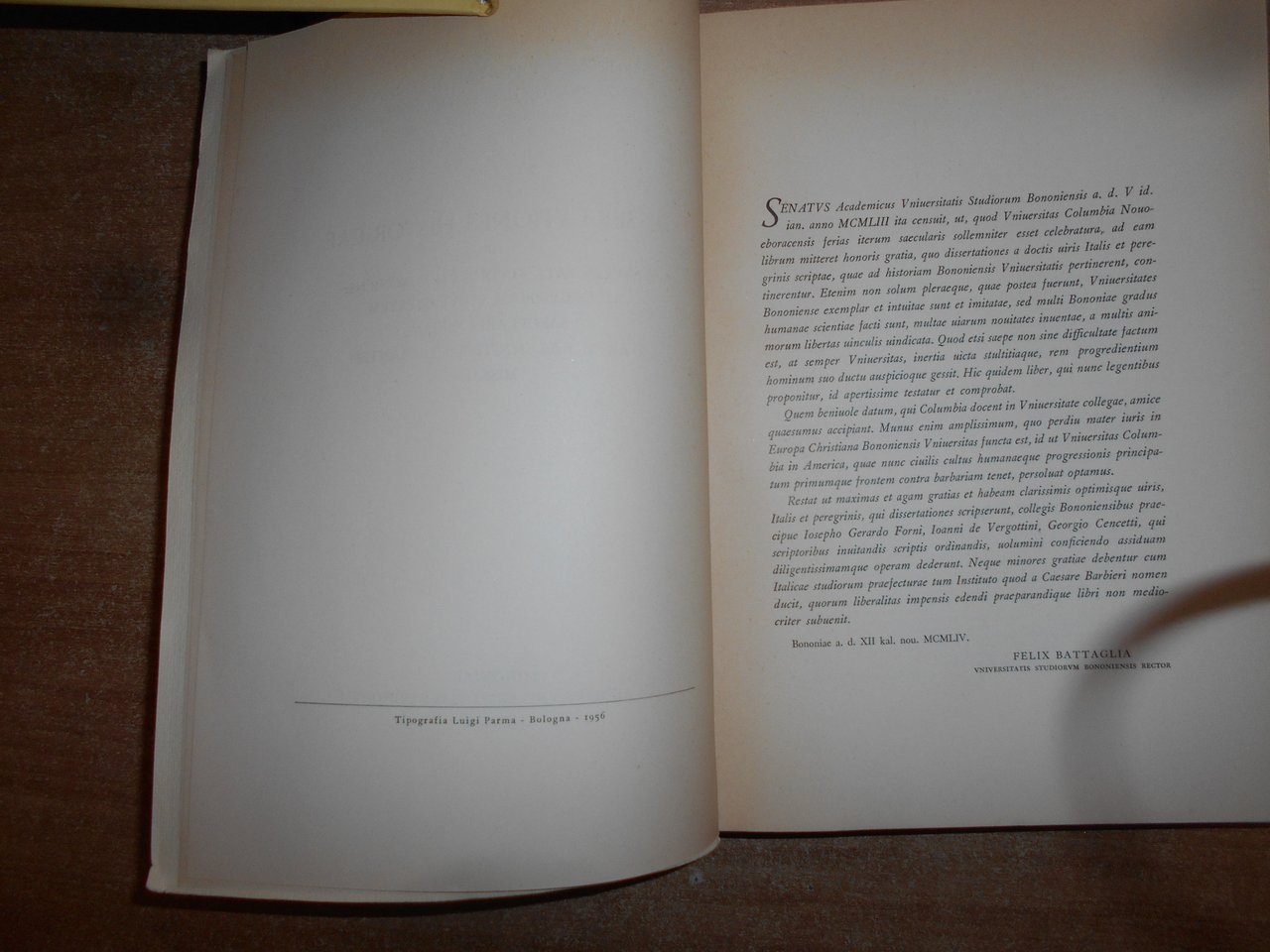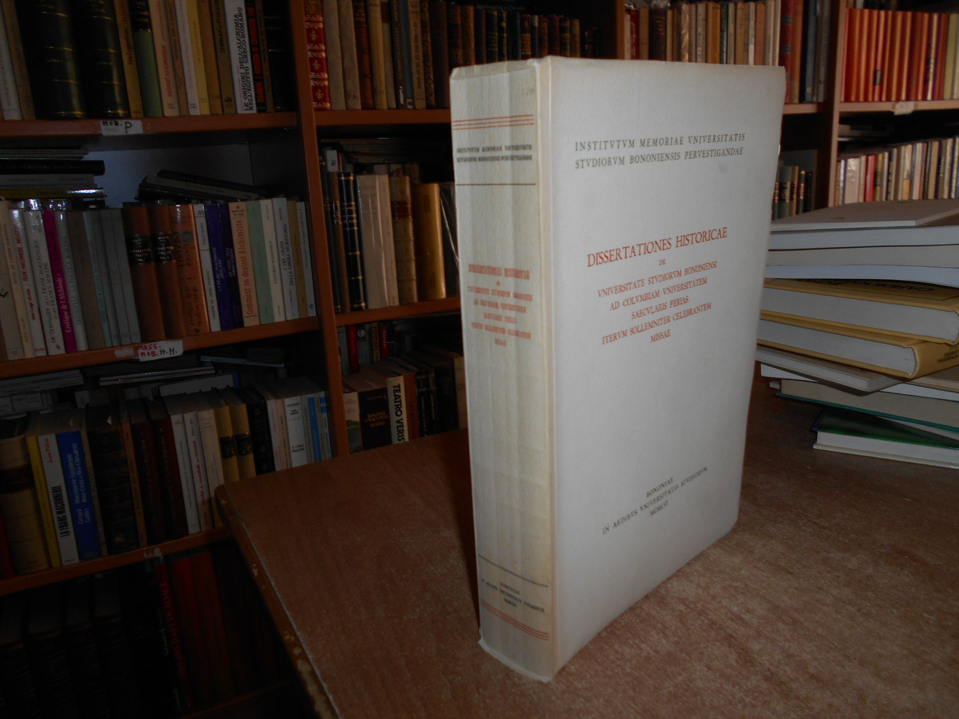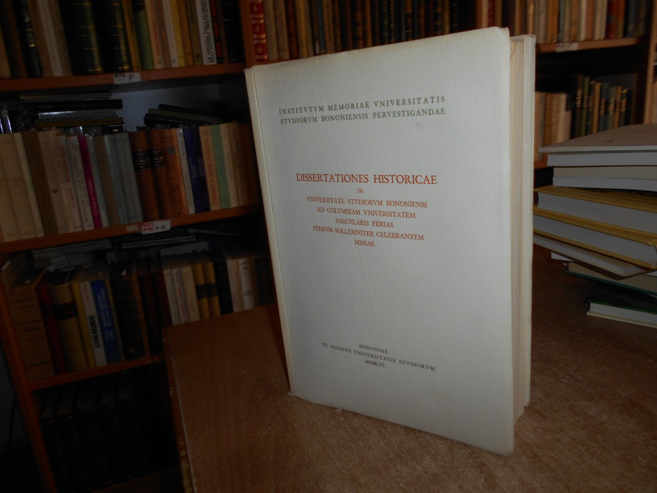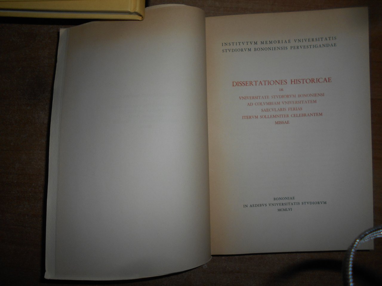 Dissertationes historicae de Universitate Studiorum Bononiensi ad Columbiam universitatem saecularis ferias iterum sollemniter celebrantem missae. Bononiae. In Aedibus Universitatis Studiorum, MCMLVI. In 8° gr., brossura edit. pp. 646, , tavv. in nero fuori testo. In ottimo stato. Uff. stanzetta a sinistra I - 3