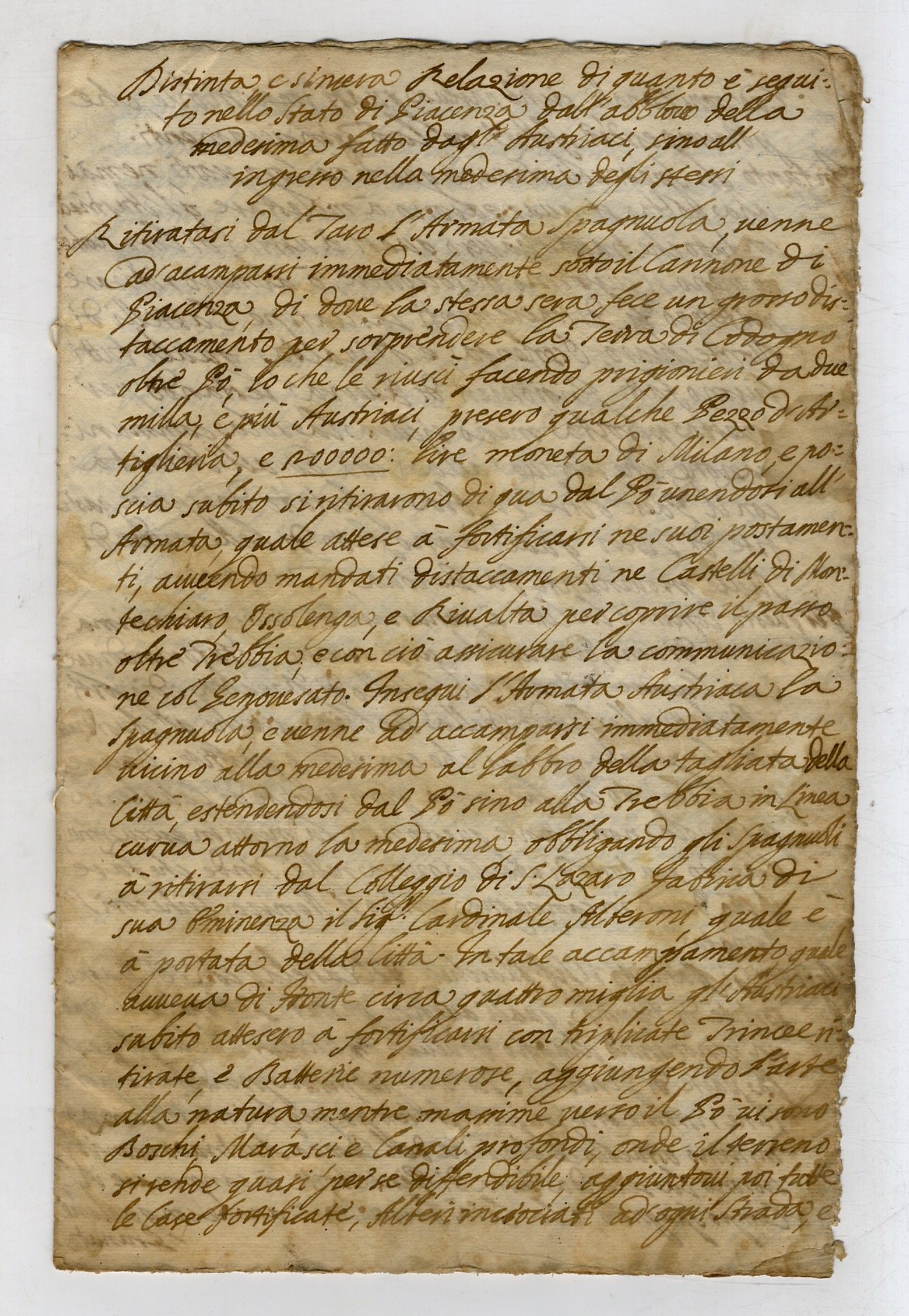 - MANOSCRITTO, manoscritti, PIACENZA, XVIII SECOLO, Battaglia di Piacenza.