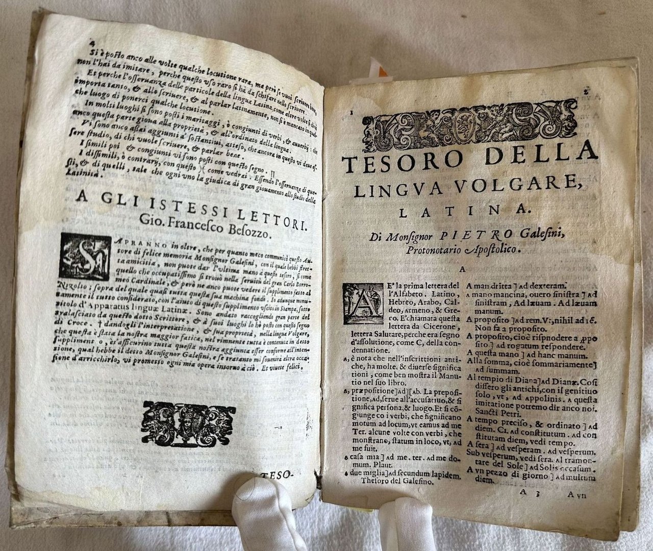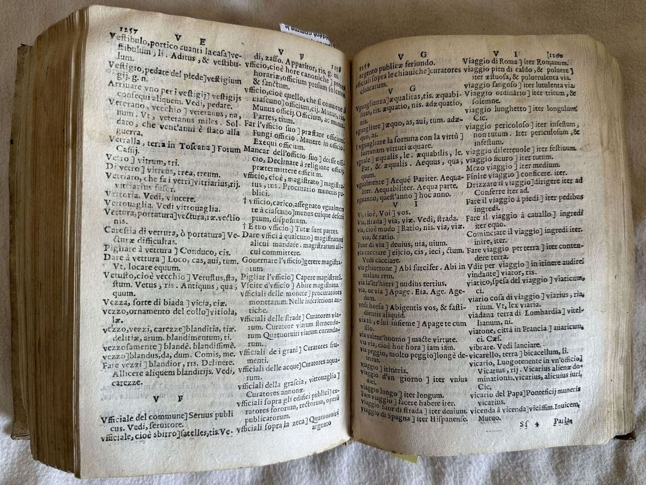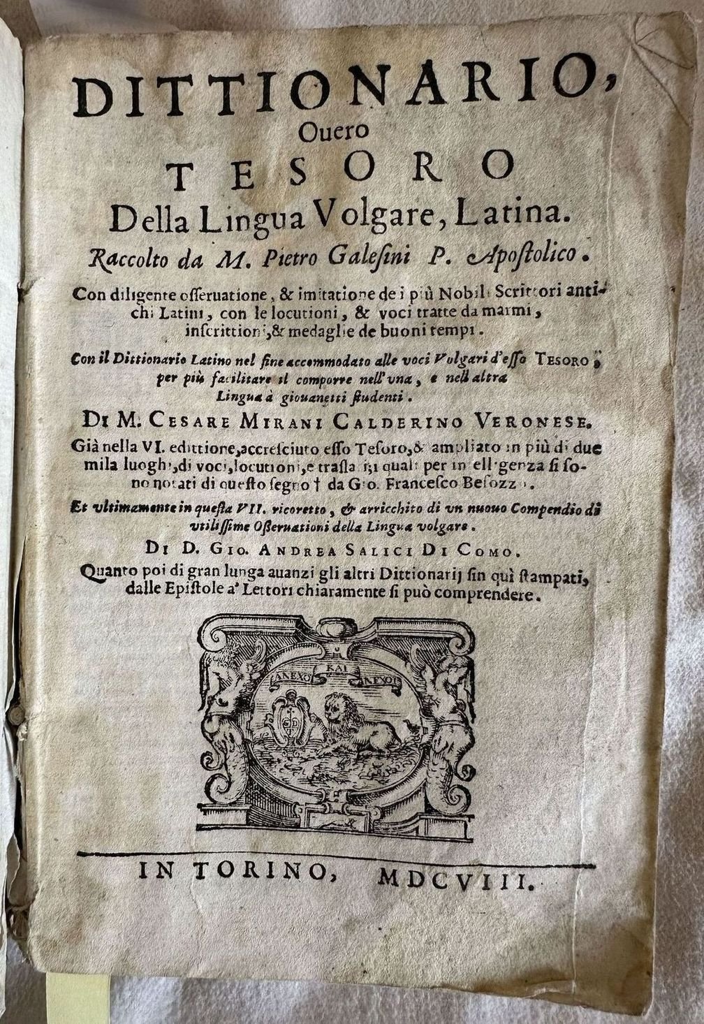 Rara edizione del 1608 di questo dizionario italiano latino a cura di Pietro Galesini (1520 ca - 1590) protonotario apostolico. Parte dal latino all'italiano e dal latino all'italiano. Dizionario latino italiano a cura di Cesare Mirani Calderino da Verona. Segue compendio sull'ortografia di Aldo Manuzio (Ortographiae Aldi Mannuccii Pauli F. Aldi) e "Compendio d'utilissime ossereationi nella lingua volgare" di Gio. Andrea Salici (Lettere dell'alfabeto, articoli, pronomi, proposizioni, avverbi ecc.). Antica firma del vecchio proprietario proveniente dalla città francese di Briancon con lettere iniziali finemente decorate alla prima carta bianca. In buone condizioni. Copertina in piena pergamena coeva in buone condizioni generali con lievi usure ai margini e dorso. Legatura in buone condizioni ma corpo del libro in parte staccato dalla legatura. Pagine in ottime condizioni con rare fioriture. Errori di numerazione. In 8. Dim. 19x13 cm. Pp. (4)+1940+(1).Scarce edition of 1608 of this italian latin dictionary by Pietro Galesini (1520 ca - 1590) apostolic protonotary. Part from latin into italian and from latin into italian language. Latin dicitonary cared by Cesare Mirani Calderino da Verona. Then compendium about ortography by Aldo Manuzio (Ortographiae Aldi Mannuccii Pauli F. Aldi) "Compendio d'utilissime ossereationi nella lingua volgare" by Gio. Andrea Salici (Letters from alphabet, articles, pronouns, propositions, adverbs ecc.). Ancient signature of the ex owner from the french city of Briancon with initial letters finely decorated in the first blank page. In good conditions. Full parchment cover in good general conditions lightly worn in the extremities. Binding in good conditions bu the body of the book partially detached from binding. Inside pages are in very good conditions with occasional foxing. Faults in numbering. In 8. Dim. 19x13 cm. Pp. (4)+1940+(1).