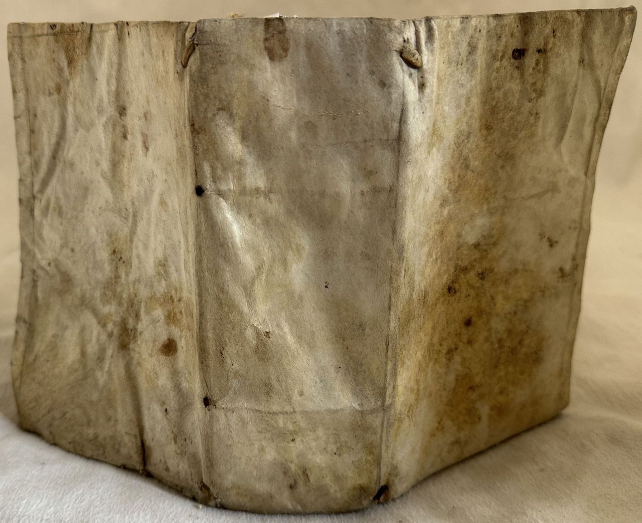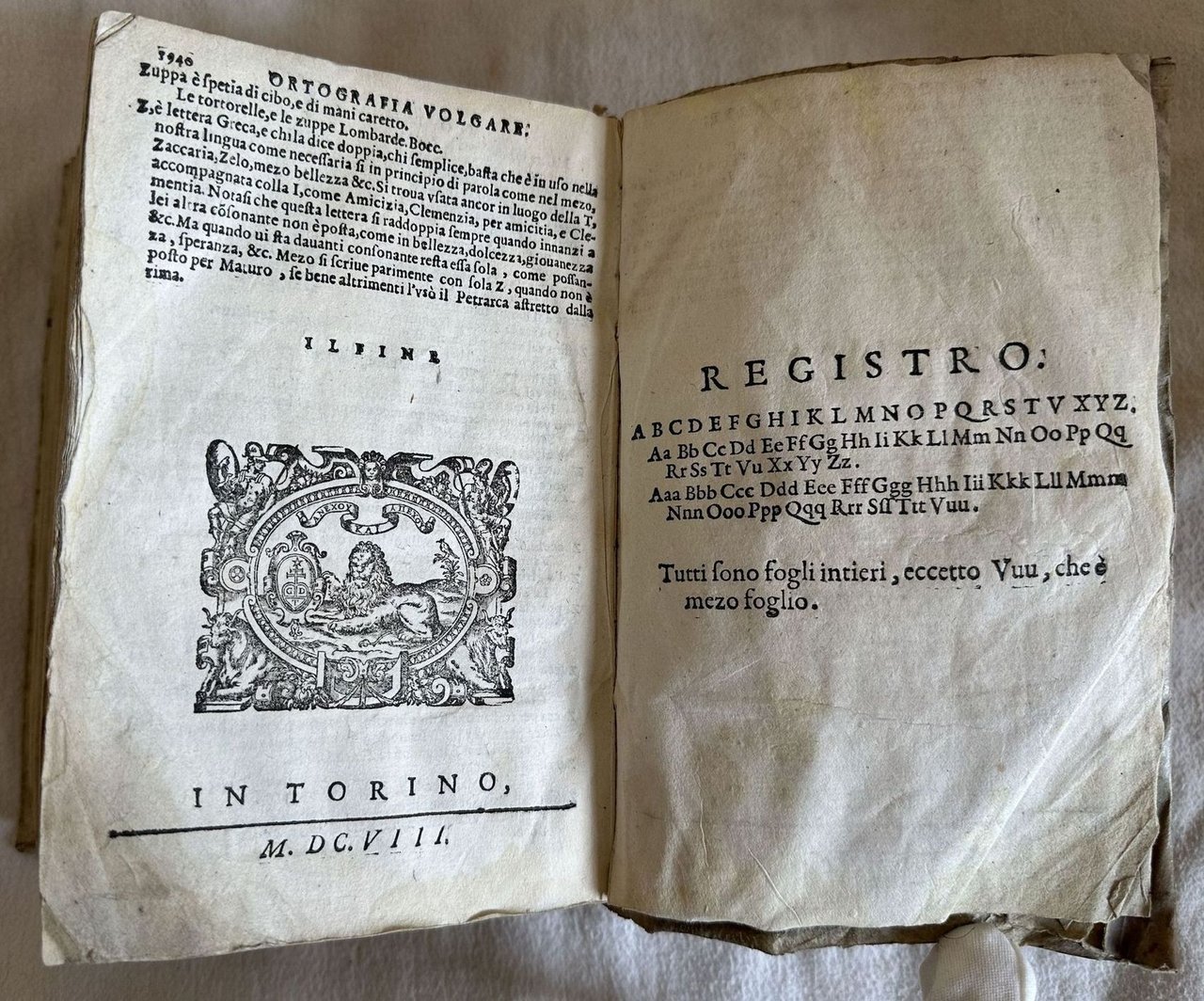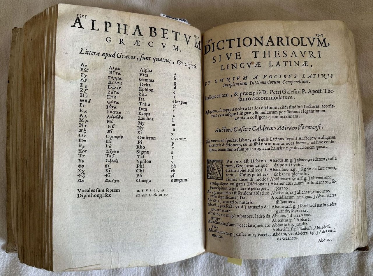 Rara edizione del 1608 di questo dizionario italiano latino a cura di Pietro Galesini (1520 ca - 1590) protonotario apostolico. Parte dal latino all'italiano e dal latino all'italiano. Dizionario latino italiano a cura di Cesare Mirani Calderino da Verona. Segue compendio sull'ortografia di Aldo Manuzio (Ortographiae Aldi Mannuccii Pauli F. Aldi) e "Compendio d'utilissime ossereationi nella lingua volgare" di Gio. Andrea Salici (Lettere dell'alfabeto, articoli, pronomi, proposizioni, avverbi ecc.). Antica firma del vecchio proprietario proveniente dalla città francese di Briancon con lettere iniziali finemente decorate alla prima carta bianca. In buone condizioni. Copertina in piena pergamena coeva in buone condizioni generali con lievi usure ai margini e dorso. Legatura in buone condizioni ma corpo del libro in parte staccato dalla legatura. Pagine in ottime condizioni con rare fioriture. Errori di numerazione. In 8. Dim. 19x13 cm. Pp. (4)+1940+(1).Scarce edition of 1608 of this italian latin dictionary by Pietro Galesini (1520 ca - 1590) apostolic protonotary. Part from latin into italian and from latin into italian language. Latin dicitonary cared by Cesare Mirani Calderino da Verona. Then compendium about ortography by Aldo Manuzio (Ortographiae Aldi Mannuccii Pauli F. Aldi) "Compendio d'utilissime ossereationi nella lingua volgare" by Gio. Andrea Salici (Letters from alphabet, articles, pronouns, propositions, adverbs ecc.). Ancient signature of the ex owner from the french city of Briancon with initial letters finely decorated in the first blank page. In good conditions. Full parchment cover in good general conditions lightly worn in the extremities. Binding in good conditions bu the body of the book partially detached from binding. Inside pages are in very good conditions with occasional foxing. Faults in numbering. In 8. Dim. 19x13 cm. Pp. (4)+1940+(1).
