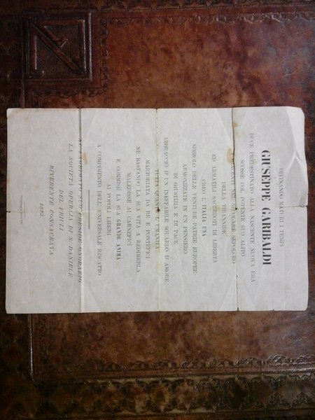 Volantino datato 1883, stampato dalla Tipogefia Biasutti, in memoria di Giuseppe Garibaldi, Presidente onorario della Società Operaia di S. Daniele del Friuli. Strappetti e macchioline