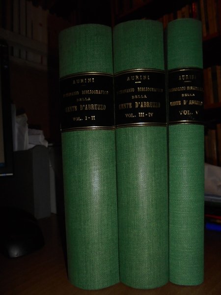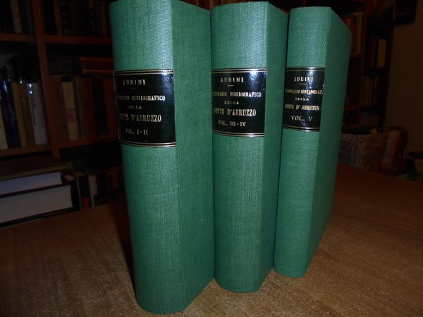 Raffaele, Aurini. Teramo, Cooperativa Tipografica << ARS ET LABOR >>, 1952/1958/1973. 5 volumi legati in 3 volumi in-8°, tela verde (legatura recente) con le copertine originali conservate, titoli in oro entro tasselli ai dorsi. xvi, 477, (1) pp.; 478 pp.; 477, (1) pp.; 486 pp.; 515 pp. I 5 volumi sono corredati da numerosi ritratti nel testo. Perfetto esemplare in legatura recente con le copertine originali conservate. Uff. A - I - 6