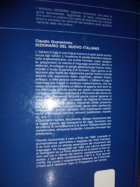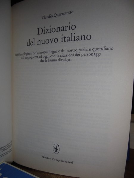 Dizionario del nuovo italiano. 8000 neologismi della nostra lingua e del nostro parlare quotidiano dal dopoguerra ad oggi, con le citazioni dei personaggi che li hanno divulgati. Claudio, QUARANTOTTO - Roma, Newton, Compton Editori, 1987. In-8°, cartonato colorato, 533 pp. In ottimo stato di conservazione. Neg. scienze mob. R dietro. Altra copia in come nuova Uff. TV. mob. fronte nostro.