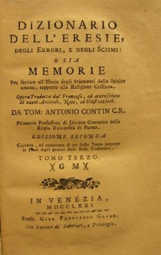 Dizionario dell'Eresie, degli Errori, e degli Scismi: o sia Memorie per servire all'Istoria degli Sviamenti dello Spirito umano, rapporto alla Religione Cristiana. Tomo terzo. Opera Tradotta dal Francese, ed accresciuta di nuovi Articoli, Note, ed Illustrazioni, da Tom: Antonio Contin C.R., Primario Professore di Diritto Canonico nella Regia Università di Parma. Edizione seconda. Corretta, ed aumentata di un Sesto Tomo intorno le Frodi degli Eretici dello stesso Traduttore.