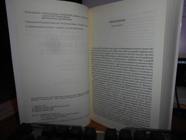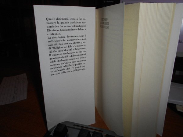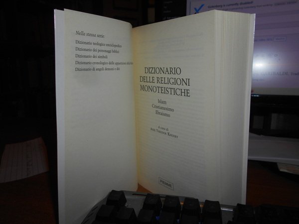 A cura di KHOURY ADEL THEODOR. Casale Monferrato, Edizioni Piemme, 1991. Dizionario delle Religioni monoteistiche. Ebraismo. Cristianesimo. Islam. In-8°, cartoncino edit. con risvolti. 813 pp. Come nuovo. Uff. stanz. TV. mob. fronte nostro