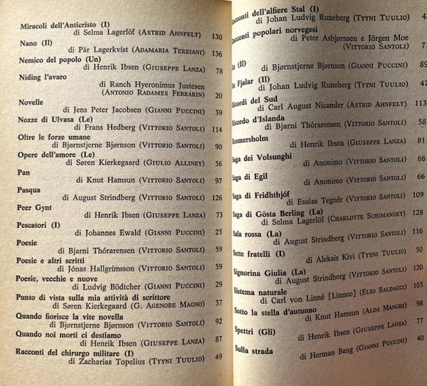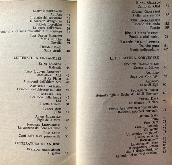 Soggetti: Storia delle letterature scandinave, Critica letteraria, Nordisk råds litteraturpris, Età vichinga, Saghe medievali, Ottocento, Henrik Ibsen, August Strindberg, Hans Christian Andersen, Selma Lagerlöf, Knut Hamsun, Novecento, Karen Blixen, Halldór Laxness, Ingmar Bergman, Astrid Lindgren, Contemporanea, Per Olov Enquist, Dag Solstad, Peter Høeg, Karl Ove Knausgård, Letteratura nazionale, Faroese, Islanda, Norvegia, Svezia, Danimarca, Norreno, Edda, Finlandia, Classici, Tove Jansson, Narrativa infantile, Giallo nordico, Romanzi, Racconti, Trame, Indici, Autori, Opere, Teatro, Assurdo, Cronologia, Riferimento, Cultura nordica, Cinema, Saga, Mitologia nordica, Ghiacci, Neve, Luoghi, Autori, Bibliografia, Capolavori, Lettura, Infanzia, Per ragazzi, Favole, Fiabe, Dizionari letterari, Saggi, Libri Vintage Fuori catalogo, Scandinavia, Natura, Drammaturgia, Commedia, Tragedia, Studi nordici, Norge, Poesia, Antologie, Raccolte, Elenchi, Groenlandia, Isole Åland, Fær Øer, Hans Christian Andersen, Knut Hamsun, Nobel, Pär Lagerkvist, La mia Africa, Sydney Pollack, Den Afrikanske Farm, Out of Africa, Il pranzo di Babette, Babettes gæstebud, Gabriel Axel, Søren Kierkegaard, Esistenzialismo, Karin Boye, Edith Södergran, Per Olof Enquist, Torgny Lindgren, Birgitta Trotzig, Dag Solstad, Einar Økland, Inger Christensen, Klaus Rifbjerg, L'imperatore di Portugallia, Kejasaren av Portugallien, Il nostro bisogno di consolazione, Värt behov av tröst, Stig Dagerman, L'anno della lepre, Jäniksen vuosi, Arto Paasilinna, Bibi, Il libro dell'estate, Sommarboken, Jussi Adler-Olsen, Jo Nesbø, Thriller, Il cacciatore di teste, Hodejegerne, Hlberg, Steffens, Romanticismo danese, Realismo, Nazionalismo, Alexis Kivi, Aftonbladet, Atterbom, Misticismo, Laxness, Canti popolari, Correggio, Tycho Brahe, Astronomia, Wessel, Ewald, Ingemann, Heiberg, Bodtcher, Filosofia, Aut-Aut, Jakobsen, Eino Leino, Lea, Topelius, Lonnrot, Jarnefelt, Asgrimsson, Gilsson, Canto di Olaf, Hallgrimsson, Thorarensen, Petter Dass, Snorri, Peer Gynt, L'anitra selvatica, Costruttore Solness, Spettri, Brand, Amalie Skram, Knut Hamsun, Jonas Lie, Bjornson, Rudbeck, von Heidenstam, Classicità, Germanesimo, Karlfeldt, Barabba, August Blanche, Swedenberg, Tegner, Stagnelius, Nicander, Rydberg, Anonimi, Enten-Eller, Svedesi, Carlo XII, Ultimo Ateniese, Viaggio, Sud, Novelle, History of Scandinavian literatures, Literary criticism, Viking age, Medieval sagas, Nineteenth century, Twentieth century, Contemporary, National literature, Faroese, Iceland, Norway, Sweden, Denmark, Norse, Finland, Classics, Children's fiction, Nordic mystery, Novels, Tales, Plots, Indexes, Authors, Works, Theater, Absurd, Chronology, Reference, Nordic culture, Cinema, Saga, Nordic mythology, Ice, Snow, Places, Authors, Bibliography, Masterpieces, Reading, Childhood, For kids, Fables, Fairy tales, Literary dictionaries, Essays, Out of print books, Nature, Dramaturgy, Comedy, Tragedy, Nordic studies, Poetry, Anthologies, Collections, Lists, Greenland, Our need for consolation, The Year of the hare, The book of Summer, The hunter Of heads, Danish romanticism, Realism, Nationalism, Mysticism, Folk songs, Astronomy, The wild duck, Builder Solness, Specters, Classicism, Germanism, Barabbas, Anonymous, Swedish, Charles XII, Last Athenian, Travels, South, Novelle, Linneo