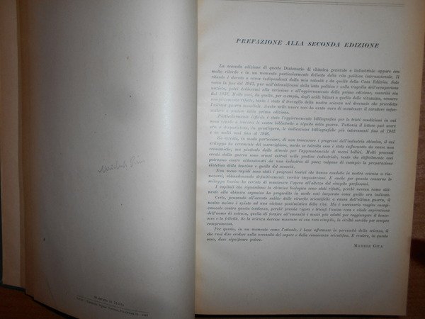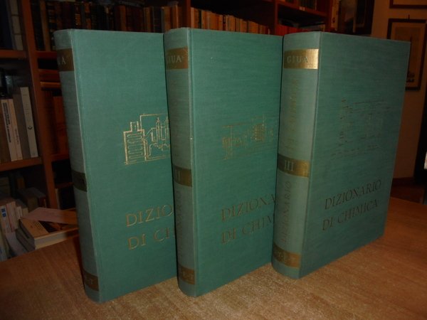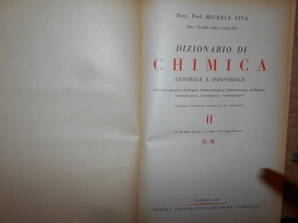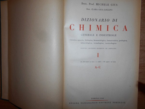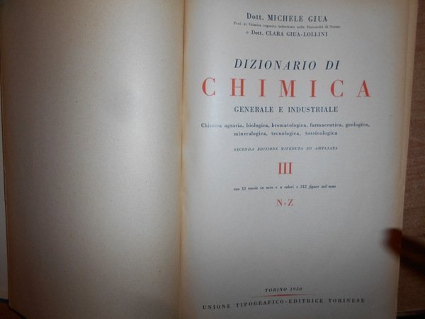 MICHELE GIUA e CLARA GIUA-LOLLINI. Torino, Unione Tipografico Editrice Torinese, 1948 - 1949 - 1950. DIZIONARIO di CHIMICA GENERALE e INDUSTRIALE. Chimica agraria, biologica, bromatologica, farmaceutica, geologica, mineralogica, tecnologica, tossicologica. Seconda edizione riveduta ed ampliata. 3 volumi in-4°, tela verde edit. con fregi e titoli in oro sui piani e nei dorsi. Vol. I. (iv), 1073 pp. con 28 tavole in nero e a colori e 451 figure nel testo. Vol. II. (ii), 817 pp. con 20 tavole in nero e a colori e 453 figure nel testo. Vol. III. (ii), 921, (1) pp. con 13 tavole in nero e a colori e 312 figure nel testo. Ottimi esemplari con normali segni del tempo. Uff. stanz. antic. mob. 14