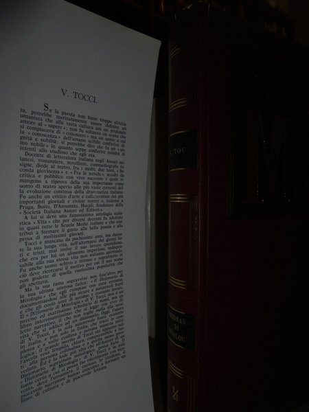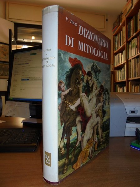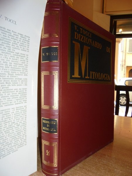 V. TOCCI. Torino, Edizioni Librarie Italiane, 1958. Dizionario di Mitologia. In-8° grande, similpelle bordeaux con fregi e titoli in oro sul piano e al dorso, sovracopertina ill. a col. viii, 540 pp. con numerose illustrazioni in bianco e nero nel testo. Esemplare con alcuni piccoli strappi nella sovracopertina peraltro libro in ottimo stato di conservazione. Neg. storia.