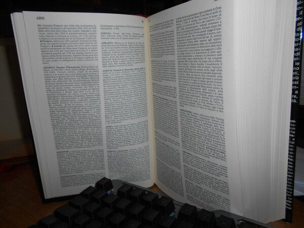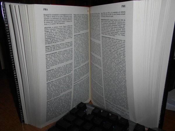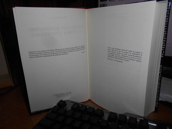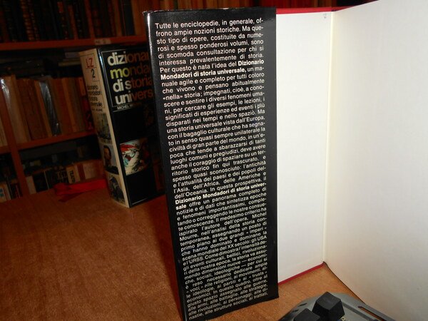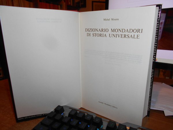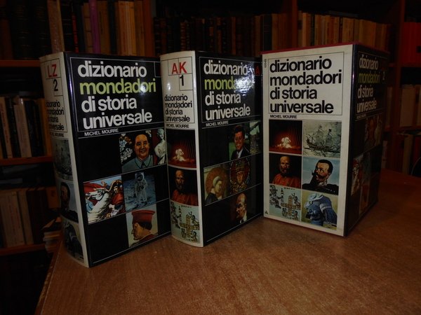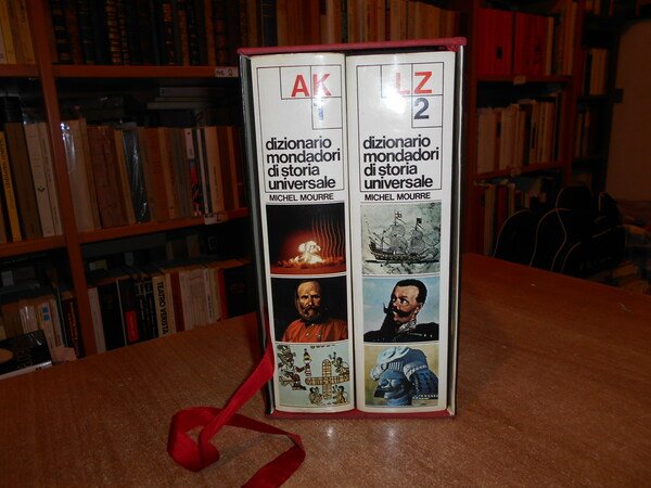 MICHEL MOURRE. Milano, Mondadori, 1974. Dizionario di Storia Universale. 2 volumi in-8°, tela rossa con titoli bianchi sui piani e nei dorsi, sovracopertina ill. a col. 1217 pp.; 1367 pp. Perfetto esemplare con cofanetto. Uff. stanz. TV. mob. fronte nostro.