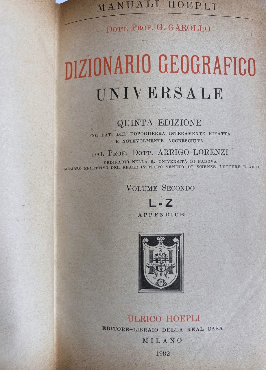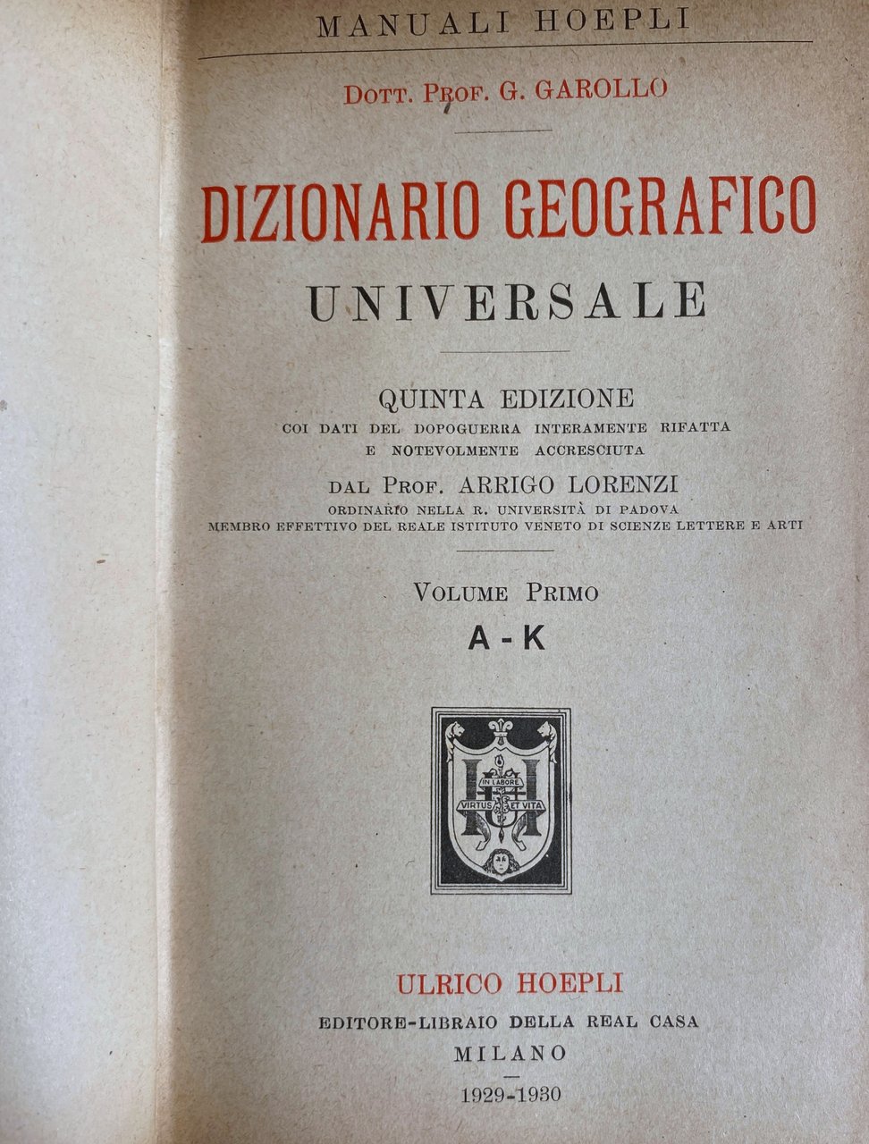 - Geografia, Collezionismo, Manualetti Hoepli, Manuali Hoepli, Dizionari, Enciclopedie, Anni Trenta, Colonialismo, Esplorazioni, Terminologia, Concetti, Termini, Nomi, Repertorio, Atlanti, Dizionari geografici, Montagne, Fiumi, Laghi, Orografia, Morfologia, Dati, Mappe, Cartografia, Stati, Nazioni, Geografia Politica, Geografia Economica Geografia umana, Consultazione, Opere generali, Libri rari, Libri fuori catalogo, Libri da collezione, Voci, Lemmi, Dopoguerra, Geografia Fisica, Etnologia, Etnografia, Confini, Frontiere, Mari, Terra, Globo terrestre, Meridiani, Congresso Geografico, Carte, Continenti, Novecento, Densità, Popolazioni, Abitanti, Climatologia, Climi, Clima, Regioni, Luoghi, Toponomastica