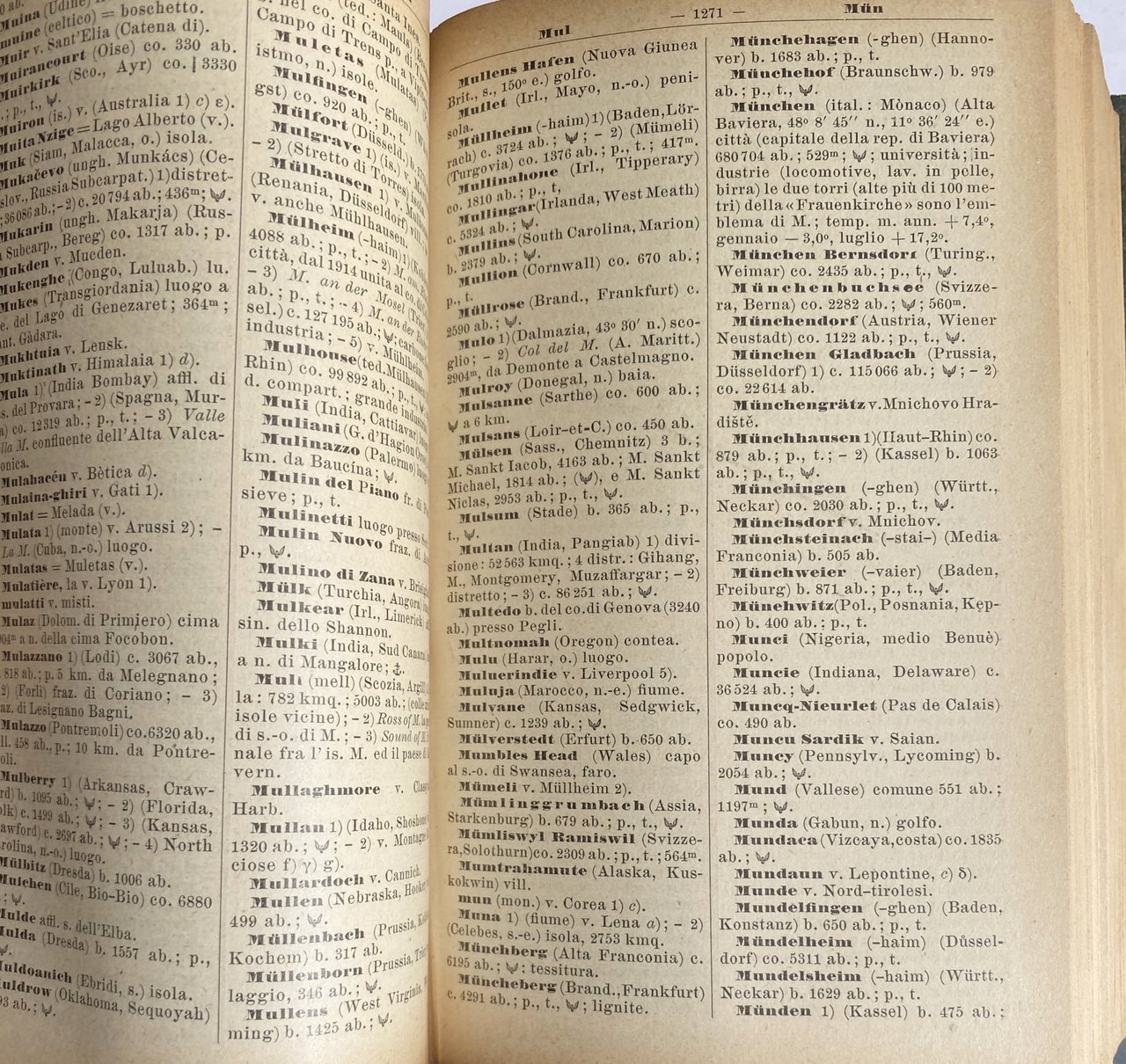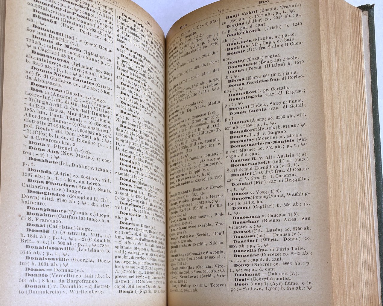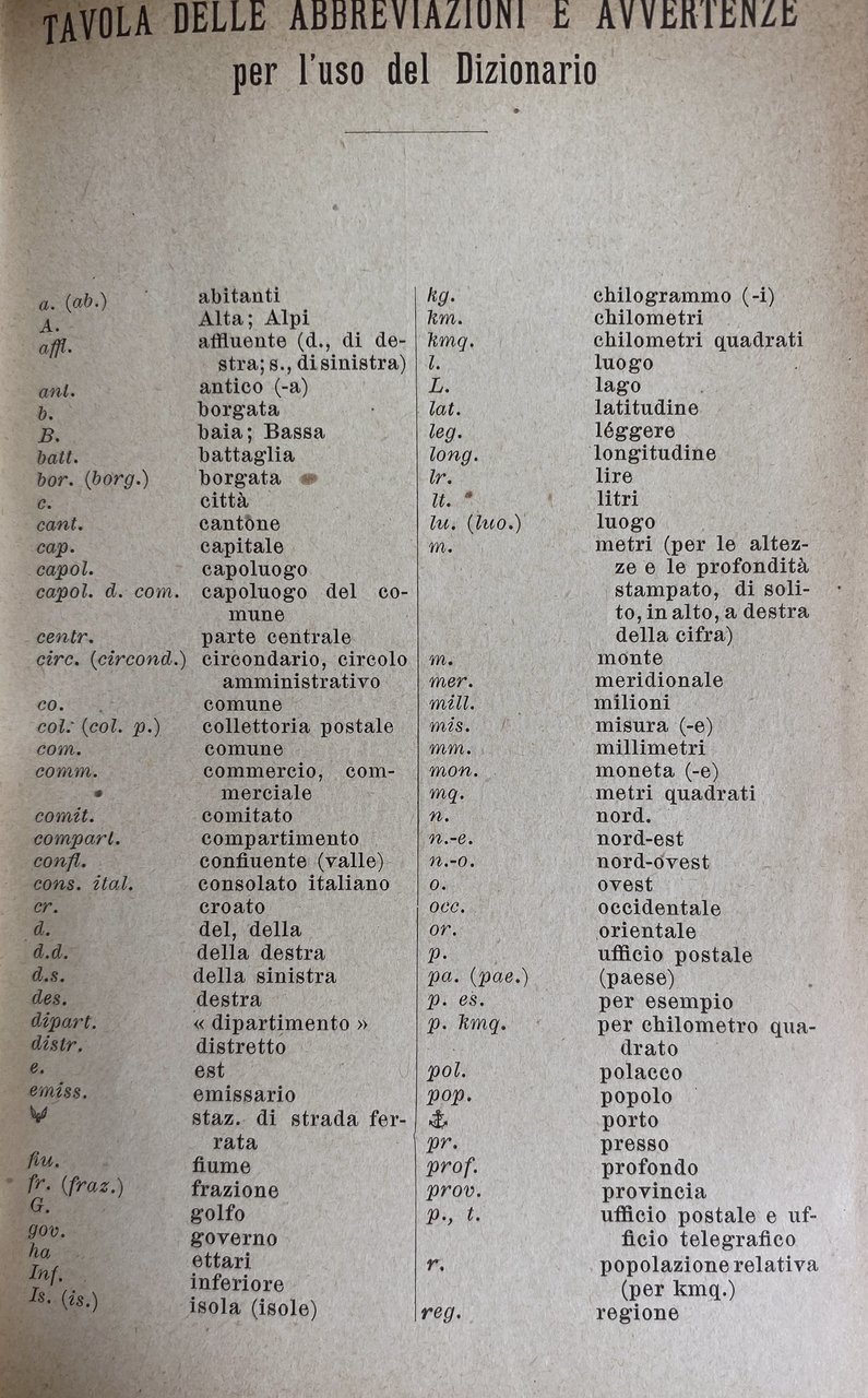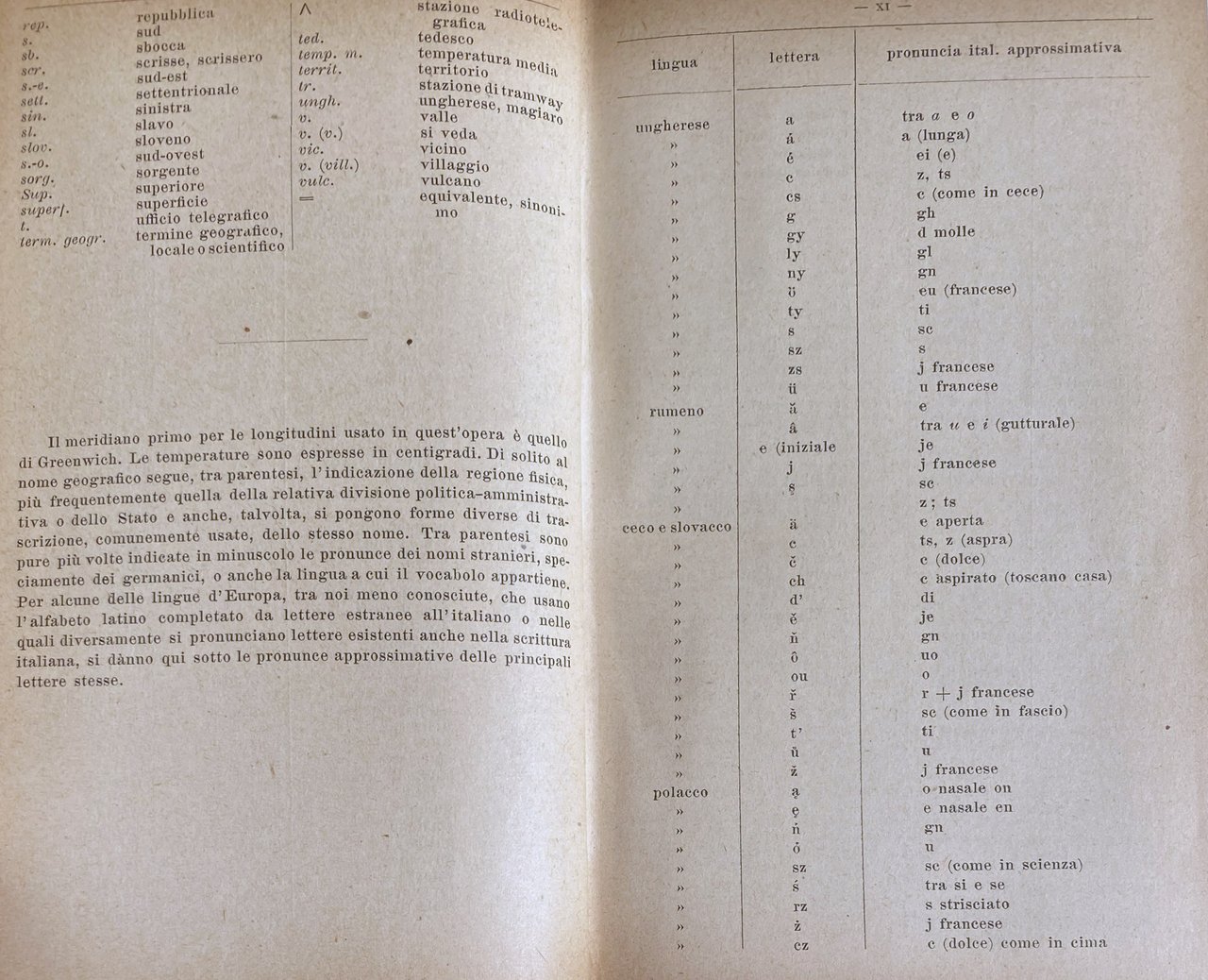 Soggetti: Geografia Collezionismo Manualetti Dizionari Enciclopedie Anni Trenta Colonialismo Imperialismo Conquiste Esplorazioni geografiche Terminologia Concetti Termini Nomi Repertorio Antologie raccolte Montagna Fiumi Laghi Orografia Morfologia Dati Mappe Cartografia Territorio Stati nazioni Politica Economica Consultazione Bibliografia Riferimento Elenchi Opere generali Libri rari fuori catalogo Voci Lemmi Edizioni pregiate Stati Dopoguerra Fisica Etnologia Scienze sociali Confini Frontiere Mari Terra Globo terrestre Bussola Meridiani Congresso Geografico Ritter Kiepert Schotte Carte Continenti Europa Asia Americhe Australia Africa Atlanti Weiss Kampen Alpi Mayr Chavanne Nietmann Vogel Arrigoni Novecento Schiaparelli Keller Vigoni Bianchi Dal Verme Grégoire Del Balzo De Amicis Densità Popolazioni Abitanti Afghanistan Equatore America Arabia Atlantico Baia Brasile Canale Capitali Catene montuose Cile Cina Città Porto Congo Costa Danubio Filippine Fiume Foce Francia Giappone Golfo Grecia Greenwich Guinea Incisioni India Gran Bretagna Impero britannico Colonie Oltremare Indiani Inghilterra Isole Italia Misure Luzon Melanesia Messico Milioni Monete Monti Navigazione Negri Nord Paesi Bassi Paralleli Pioggia Climatologia Climi Clima Meteo Possedimenti Prussia Reno Russia Regioni Mare Scozia Siberia Spagna Sudan Svezia Svizzera Germania Turchia Ungheria Stati Uniti Valle Vetta Everest Himalaya Statistiche Ragionato Storico Tolomeo Strabone Regno Napoli Geografi illustri Simboli Luoghi Abbreviazioni Avvertenze Arrowsmith Busching Balbi Umana Cesare Battisti Irredentismo Venezia Giulia Friuli Lea D'Orlandi Toponomastica Ernesta Bittanti Kamchatka Informazioni Caraci Etnografia Revue de Géographie Zeitschrift Gesellschaft Erdkunde Schulgeographie Berghaus Vivien de Saint-Martin Droysens Werner Stieler Nordenskiöld Zatta Vittore Bellio Giuseppe Ricchieri Cosimo Bertacchi Società geografica Alberto Magnaghi Gian Ludovico Bertolini Moderna Humboldt Storici Geography Collectibles Manuals Dictionaries Encyclopedias Thirties Colonialism Imperialism Conquests Explorations Terminology Concepts Terms Names Repertoire Collected anthologies Mountains Rivers Lakes Orography Morphology Data Maps Cartography Territory Nation Politics Economics Consultation Bibliography Reference Lists General works Rare books out of print Entries Lemmas Precious editions Post-war Physics Ethnology Social sciences Borders Frontiers Seas Earth Globe Compass Meridians Congress Continents Europe Americas Atlases Twentieth century Density Populations Inhabitants Equator Atlantic Bay Brazil Channel Capitals Mountain ranges Chile China City Port Coast Danube Philippines River Mouth France Japan Gulf Greece Engravings Great Britain British Empire Colonies Overseas Indians England Islands Italy Measurements Mexico Navigation Blacks North Netherlands Parallels Rain Climatology Climates Weather Possessions Rhine Regions Sea Scotland Siberia Spain Sweden Switzerland Germany Turkey Hungary States United Valley Peak Statistics Historical Reasoning Ptolemy Strabo Kingdom Naples Illustrious geographers Symbols Places Abbreviations Warnings Human Toponymy Information Modern Geographical Society Historians