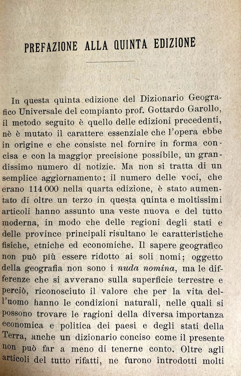 In questa quinta edizione del Dizionario Geografico Universale del compianto prof. Gottardo Garollo, il metodo seguito è quello delle edizioni precedenti, nè è mutato il carattere essenziale che l'opera ebbe in origine e che consiste nel fornire in forma concisa e con la maggior precisione possibile, un grandissimo numero di notizie. Ma non si tratta di un semplice aggiornamento: il numero delle voci, che erano 114000 nella quarta edizione, è stato aumentato di oltre un terzo in questa quinta e moltissimi articoli hanno assunto una veste nuova e del tutto moderna, in modo che delle regioni degli stati e delle province principali risultano le caratteristiche fisiche, etniche ed economiche. Il sapere geografico non può più essere ridotto ai soli nomi; oggetto della geografia non sono i nuda nomina, ma le differenze che si avverano sulla superficie terrestre e perciò, riconosciuto il valore che per la vita dell'uomo hanno le condizioni naturali, nelle quali si possono trovare le ragioni della diversa importanza economica e politica dei paesi e degli stati della Terra, anche un dizionario conciso come il presente non può far a meno di tenerne conto. Oltre agli articoli del tutto rifatti, ne furono introdotti molti altri che o rispecchiano i progressi della geografia generale e di quella esploratrice nell'ultimo trentennio o le nuove esigenze sorte dalla guerra mondiale. La quarta edizione usciva all'indomani di una nostra disgraziata impresa coloniale e la sua mole poteva essere sufficiente al bisogni di un popolo ancora debole e poco sicuro di se medesimo; questa quinta edizione corrisponde invece oso sperare alla nuova vita della nazione divenuta potente, padrona di colonie sempre più promettenti, desiderosa di stringere relazioni coi paesi più diversi e di avere nel mondo un posto adeguato ai suoi bisogni di espansione e ai sacrifici fatti nella grande guerra. Per effetto di questa, sulle rovine di tre imperi sono sorte a nuova esistenza politica piccole nazionalità, in passato pressochè sconosciute alla gran maggio. ranza di coloro che non sono geografi di professione; donde la necessità di assegnare larga parte ai nomi etnografici. I nuovi stati affermarono la loro personalità storico-geografica e il loro diritto alla vita, sostituendo, in un infinito numero di casi, alle vecchie forme della onomastica ufficiale i nomi della rispettiva lingua nazionale. Sotto il riguardo politico-nazionale, le province annesse all'Italia furono oggetto di cure speciali: i nomi geografici italiani o ladini sono al posto d'onore, quelli alloglotti, che molto spesso non sono che storpiature dei primi, furono messi loro accanto come sinonimi e ai primi rimandano sempre per le spiegazioni. Per tutte queste ragioni, la mole del dizionario è aumentata anche oltre i limiti preveduti e sarà anche necessario aggiungere al secondo volume un'appendice contenente rettifiche e i mutamenti politici e amministrativi dei quali non si sia potuto tener conto durante la stampa dell'opera. Nella scrittura dei nomi è stato mantenuto il metodo popolare già adottato dal prof. Garollo; per le lingue slave si introdussero i segni speciali con cui esse completano l'alfabeto latino. Le forme d'uso ufficiale sono state di solito accettate tali e quali. Tutto il ricco materiale cartografico e bibliografico esistente al Gabinetto di Geografia dell'Università di Padova, comprese le statistiche più recenti, è stato messo a profitto in questo lavoro che io spero sarà ancora per riuscire utile agli studiosi e agli uomini d'affari, agli uffici pubblici e a quelli privati, che vi troveranno una grande abbondanza di notizie pratiche, quali al presente non è possibile procurarsi se non consultando pubblicazioni speciali. Carlo Ritter uno dei padri della geografia moderna, non credette di fare opera men che degna dell'alto posto da cui, or fa un secolo, insegnava, formando un dizionario geografico che ebbe fortuna e che costituì una non piccola benemerenza del grande Maestro: il dizionario che ripresento al pubblico italiano è di mole più modesta, ma è l'unico, finora uscito, dopo il grande cataclisma della guerra, e io mi sentirò appagato se non avrò speso invano il mio tempo in una fatica veramente affannosa e per i profondi mutamenti politici che doveva riflettere e per le non piccole difficoltà che presentavano i minuti accertamenti geonomastici e statistici. Diligenza, circospezione e perseveranza spero avranno raggiunto il fine di far cosa utile alla coltura e alla vita pratica degli italiani. Padova, giugno 1929. ARRIGO LORENZI