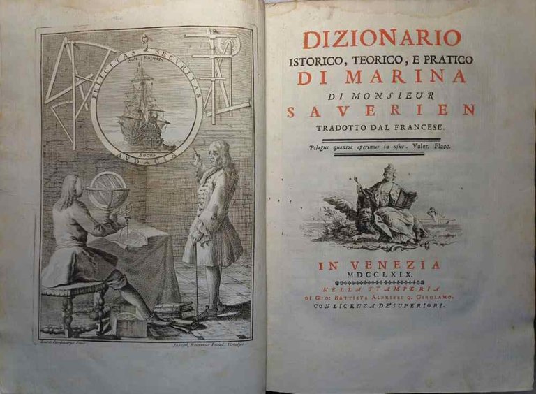 28,5 cm, in 4° grande, rilegatura ottocentesca in mezza pelle, titolo e fregi in oro al dorso, p. (4), xix, (1), 78, (2), 470, con 10 tavole fuori testo, di cui 9 tavole in fine al volume (di cui 4 ripiegate) e 1 grande tavola più volte ripiegata a p. 54. Antiporta calcografica disegnata da Luca Carlevariis e incisa da Giuseppe Baroni, frontespizio in rosso e nero con fregio tipografico. Gran parte delle illustrazioni sono tratte dal " Dictionaire de marine contenant les termes de la navigation et de l'architecture navale ." di Nicolas Aubin. Ordinari segni del tempo alla legatura e leggero alone al taglio superiore. Testo su due colonne, esemplare assai ben conservato dagli ampi margini parzialmente in barbe.