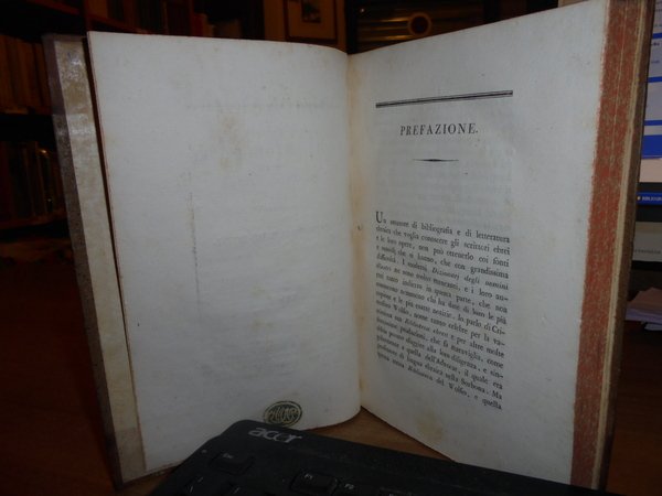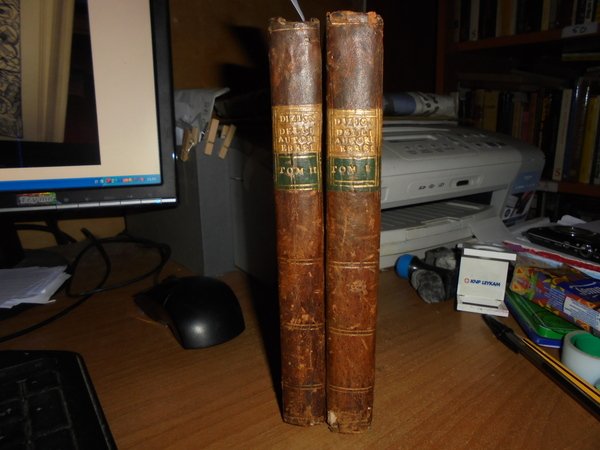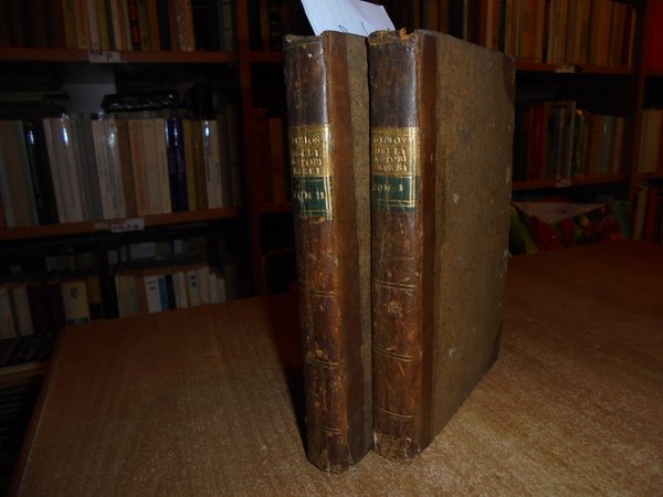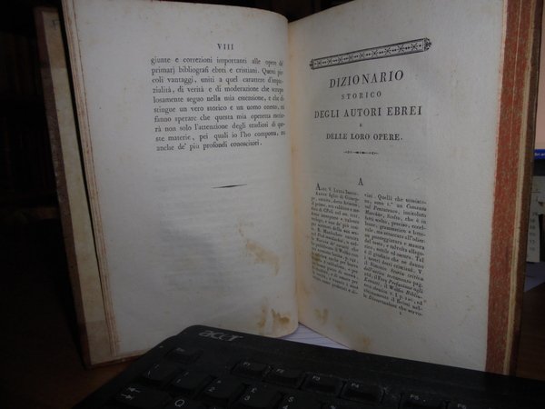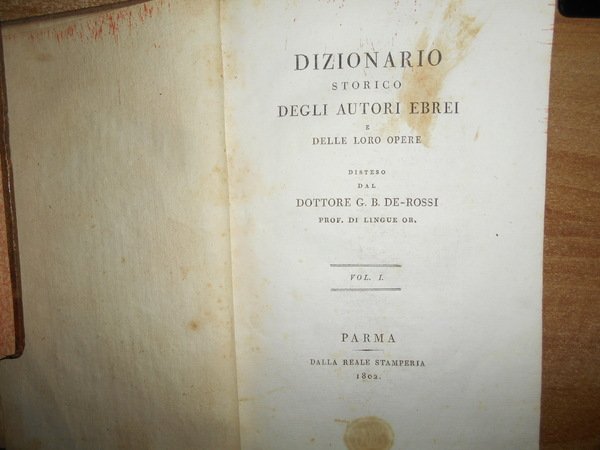 DE ROSSI Giovanni Bernardo. Dizionario Storico degli Autori Ebrei e delle loro opere. Parma, dalla Reale Stamperia, 1802. 2 voll. in-8°, (225x155 mm.), m. pelle coeva., titoli in oro su tasselli ai dorsi. (1), IX, 192; (1), 170, (1) pp. Testo su due colonne. Ottimo esemplare. Rara edizione originale di questa fondamentale bio-bibliografia, poi tradotta in tedesco nel 1839. Brunet, IV, 1407. Brooks, 881. Ebert, 19435. Graesse, VI, 169. Uff. mob. F