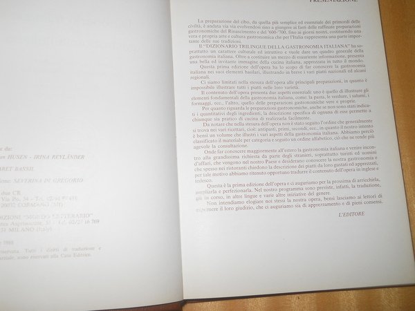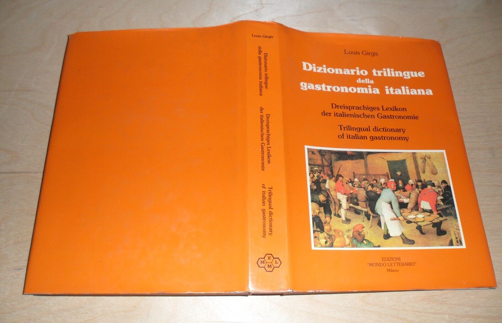 LOUIS GIRGIS, Dizionario trilingue della gastronomia italiana - ed. Mondo letterario, I ed. 1988 - copertina rigida con sovracopertina, formato cm. 18 x 25 - buonissimo stato, piccole e leggere fioriture sul bordo esterno superiore delle pagine