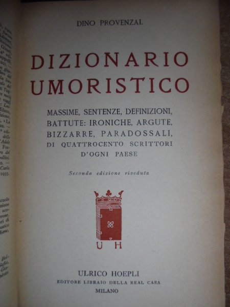 PROVENZAL, Dino - Ulrico Hoepli Editore,1937. Massime, sentenze, definizioni, battute: ironiche, argute, bizzarre, paradossali, di quattrocento scrittori d' ogni paese. Seconda edizione riveduta. In - 8°, similpelle con il titolo dorato sul dorso (abilmente restaurato), 514 pp. con alcune sottili sottolineature in poche pagine.