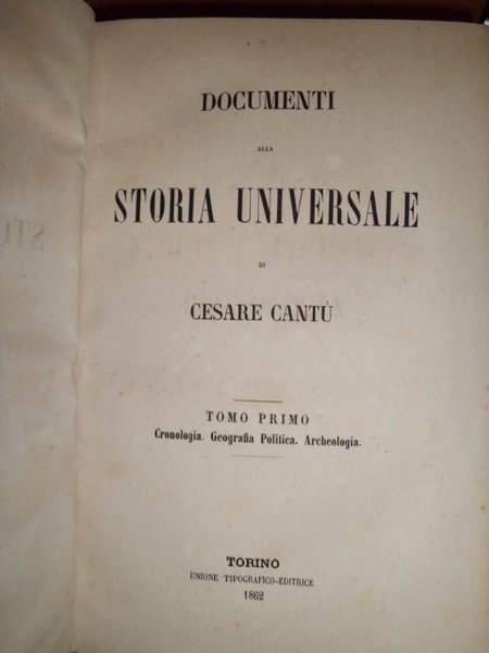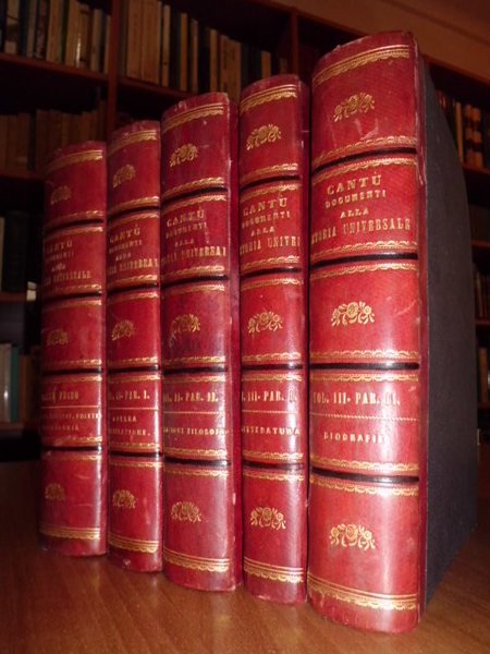 NONA EDIZIONE TORINESE RIVEDUTA DALL' AUTORE. CANTU', CESARE - TORINO, UNIONE TIPOGRAFICO-EDITRICE, 1862 - 1863 - 1865. 5 VOLUMI IN-8°, M. PELLE COEVA CON TITOLI E FREGI IN ORO SUL DORSO. TOMO PRIMO: CRONOLOGIA, GEOGRAFIA POLITICA, ARCHEOLOGIA E BELLE ARTI, 310, 399, 436 PP. PER COMPLESSIVE 1145 PP. CON ILLUSTRAZIONI N.T. TOMO SECONDO PARTE PRIMA, GUERRA, LEGISLAZIONE E DIPLOMAZIA, 322, 543 PP. PER COMPLESSIVE 865 PP. TOMO SECONDO PARTE SECONDA, SULLE RELIGIONI, 481 PP. TOMO TERZO PARTE PRIMA, LETTERATURA DISCORSI ED ESEMPI IN APPOGGIO ALLA STORIA UNIVERSALE, 636 PP. TOMO TERZO PARTE SECONDA, BIOGRAFIE PER CORREDO, 716 PP. INDICI DELLA STORIA UNIVERSALE, 280 PP. RIFIORITURE SPARSE DOVUTE ALLA QUALITÀ DELLA CARTA PERALTRO IN OTTIMO STATO DI CONSERVAZIONE.