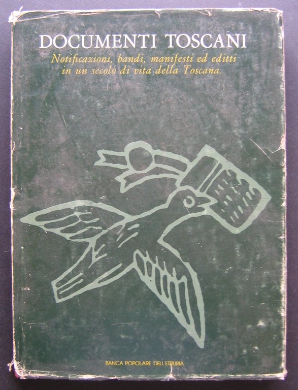 Un volume (23,5x32 cm) di XXVII-219 pagine, similpelle editoriale con sovracoperta illustrata. Usure ai margini della sovracoperta, interno in ottime condizioni. Numerosi facsimile di antichi documenti e bandi, da Pietro Leopoldo alla compiuta Unità d'Italia. Ampia bibliografia. Edizione fuori commercio. Dopo una lunga ed interessante introduzione, la serie di documenti ristampati fra i più vari, dai bandi del Granducato all'annunzio della Carriera da corrersi a Siena (il Palio dell'Assunta) al sonetto per l'espulsione delle truppe francesi da Arezzo alla Storia del brigante Federico Robili detto Gnicche.