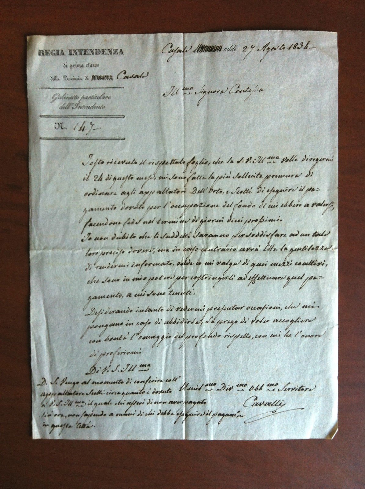 DOCUMENTO ORIGINALE 1834Regia Intendenza di primeìa classe della Provincia di Casaleformato 19,5x25,5 cmin buone condizioni E11448