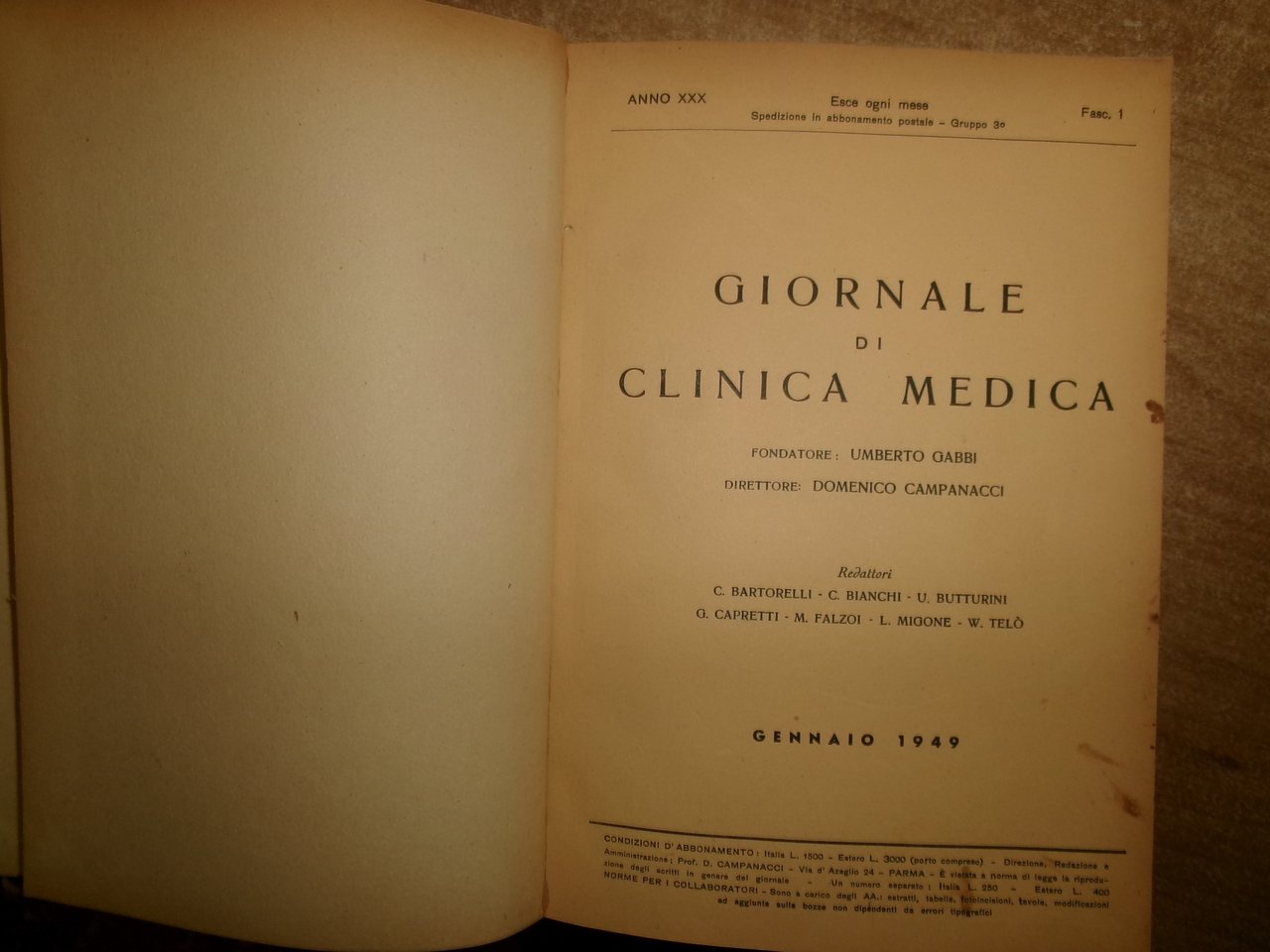 DOMENICO CAMPANACCI. Giornale di Clinica Medica 1949. 12 fascicoli in-8° legati assieme in m-tela con titolo in oro sul dorso. 1056 pp. con illustrazioni in nero n.t. Salon. sporta 3