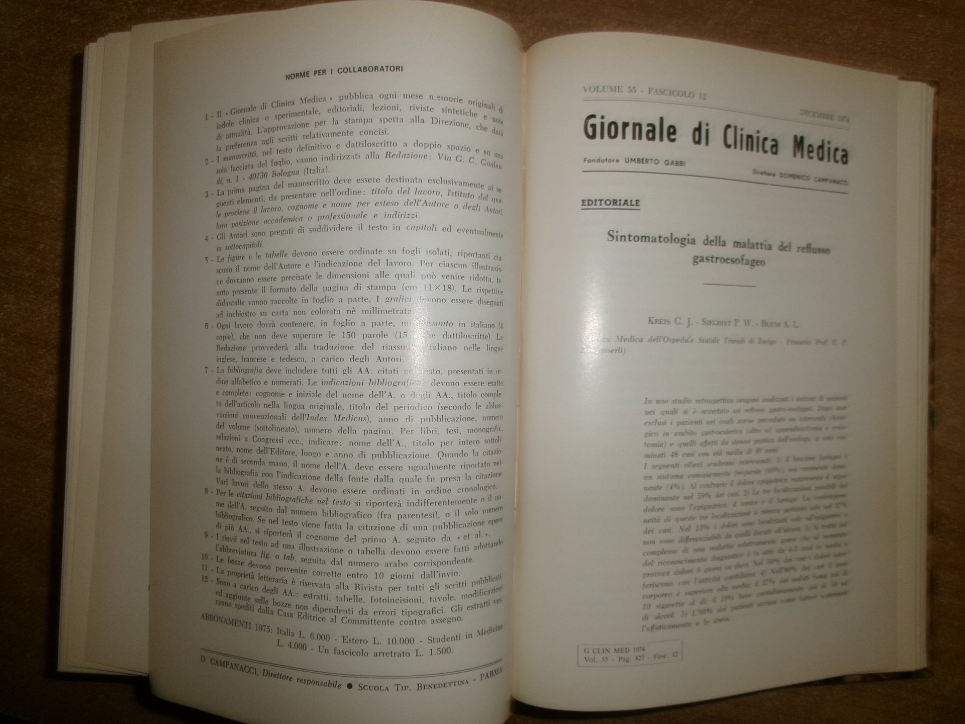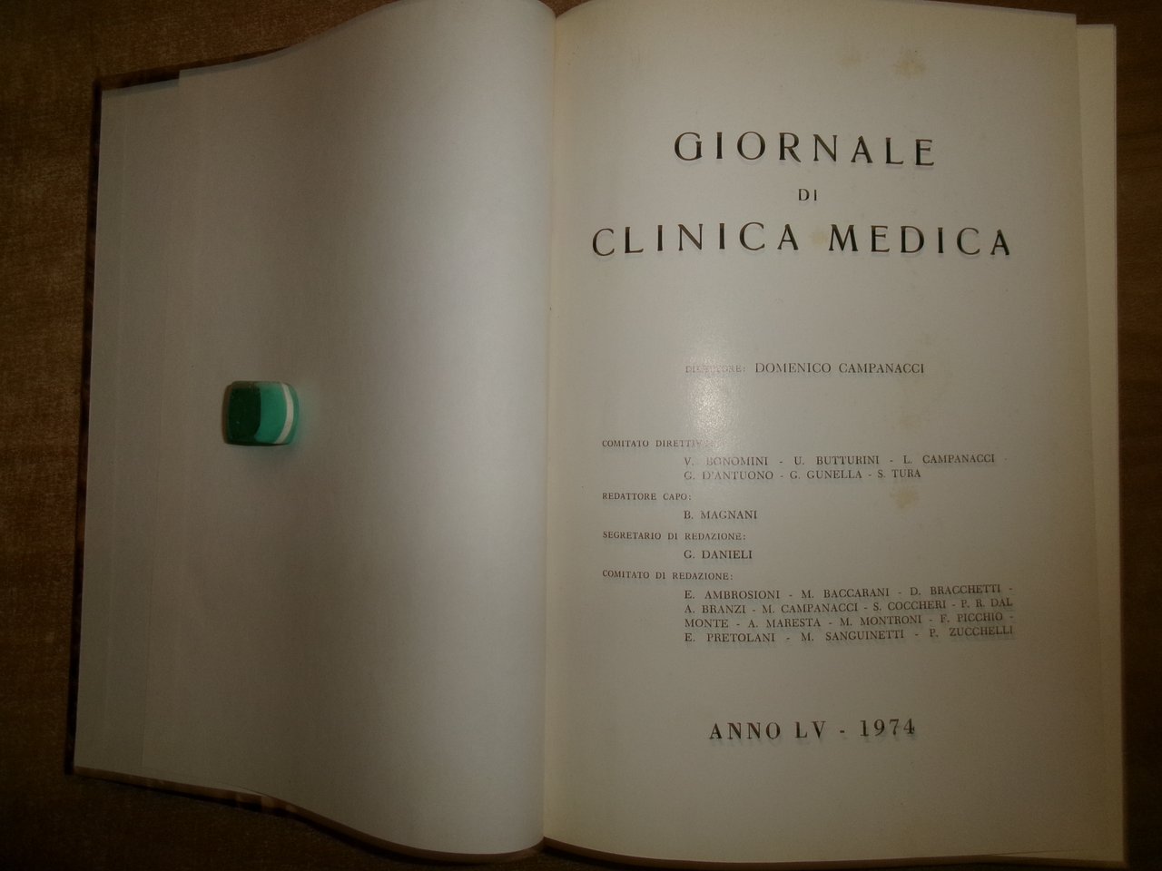 DOMENICO CAMPANACCI. Giornale di Clinica Medica 1974. 12 fascicoli in-8° legati assieme in m-tela con titolo in oro sul dorso. xi, 902 pp. con figure in nero e a colori n.t. Ottimo stato. Uff. salon. sporta 5