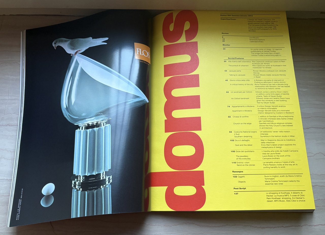 I ed. del N. 844 Gennaio/ January 2002 del periodico mensile (Domus: Via Gianni Mazzocchi 1-3 - Rozzano, Milano). Testi in italiano/inglese. IV/(58)+144=202/brossura satinata (Copertina/Cover: Il design dei fratelli Campana, che trasforma materiali e oggetti poveri in gioielli preziosi/The Campana brothers transform the banal into jewellery. Fotografia di/Photography by Willy Biondani). Illustrazioni a colori e in b/n. Art Director: Giuseppe Basile. Stato buono