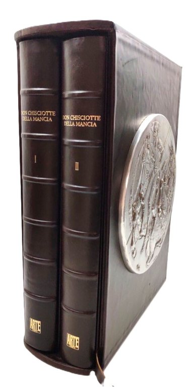 Cofanetto rigido in legno rivestito in pelle con bassorilievo in argento applicato al piatto anteriore esemplare dell'Opera Don Quijote y Sancho di Mattia Quetglas bassorilievo originale diametro 280 mm, alcune lievi abrasioni al margine superiore, vedere immagini,