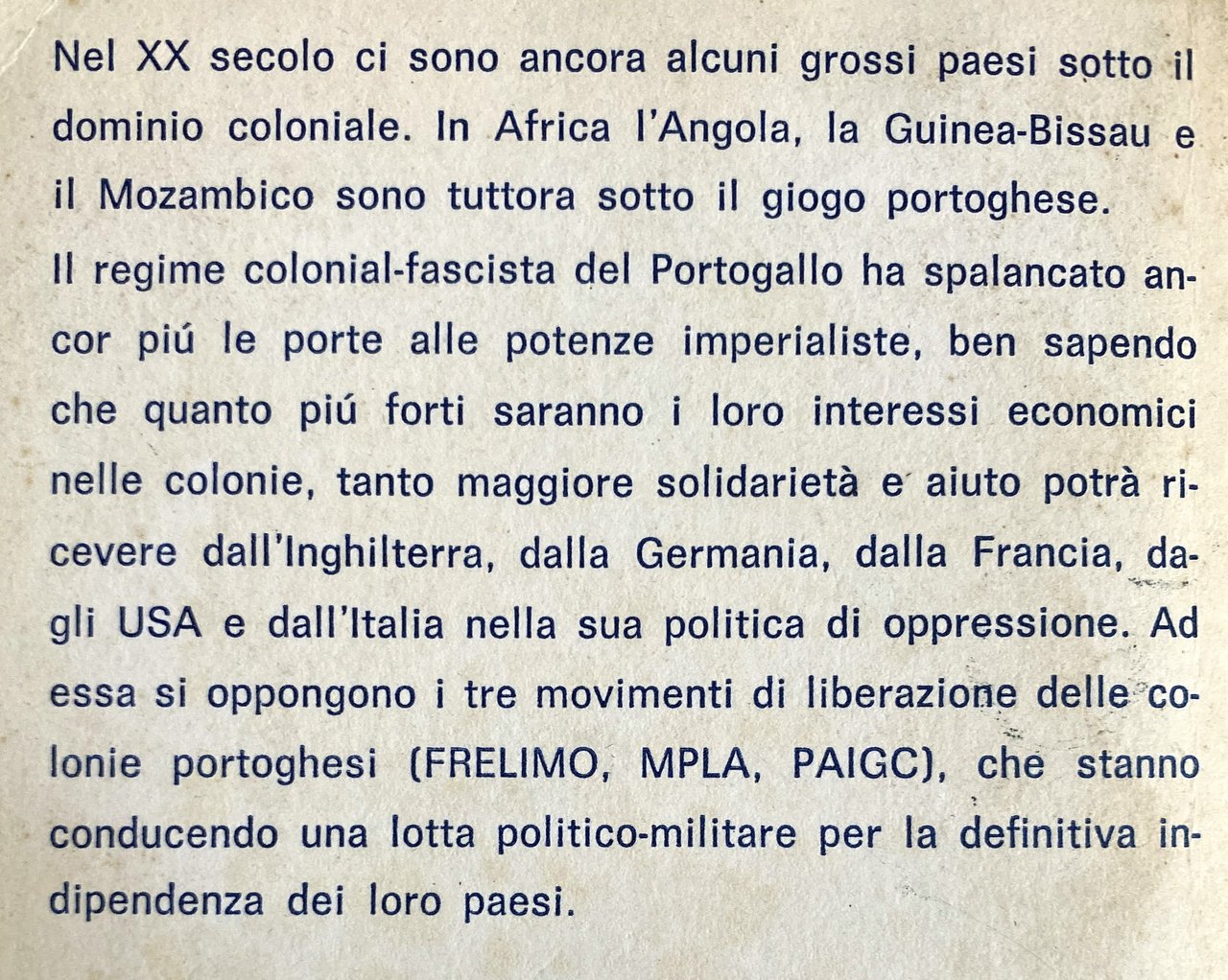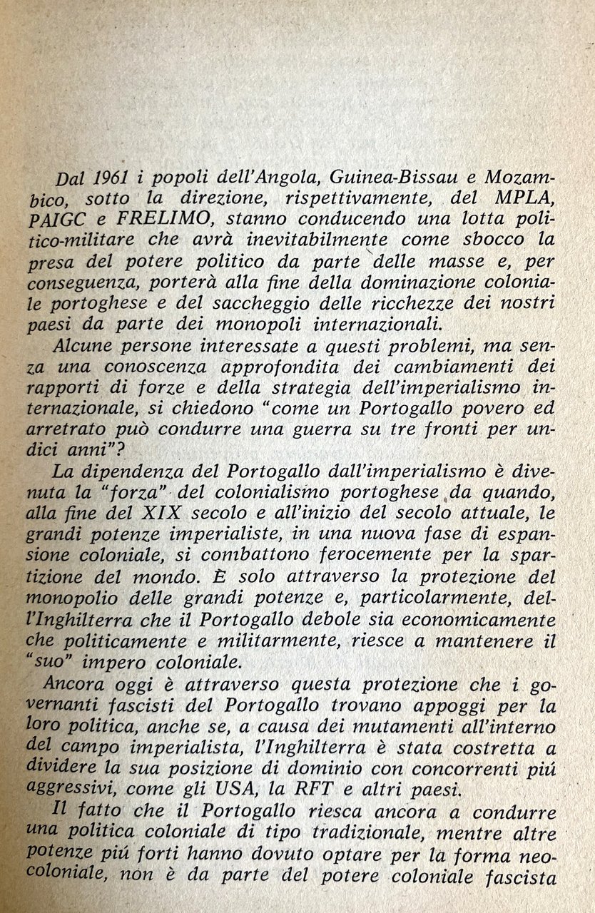 Nel XX secolo ci sono ancora alcuni grossi paesi sotto il dominio coloniale. In Africa l'Angola, la Guinea-Bissau e il Mozambico sono tuttora sotto il giogo portoghese. Il regime colonial-fascista del Portogallo ha spalancato ancor più le porte alle potenze imperialiste, ben sapendo che quanto più forti saranno i loro interessi economici nelle colonie, tanto maggiore solidarietà e aiuto potrà ricevere dall'Inghilterra, dalla Germania, dalla Francia, da-gli USA e dall'Italia nella sua politica di oppressione. Ad essa si oppongono i tre movimenti di liberazione delle colonie portoghesi (FRELIMO, MPLA, PAIGC), che stanno conducendo una lotta politico-militare per la definitiva indipendenza dei loro paesi.