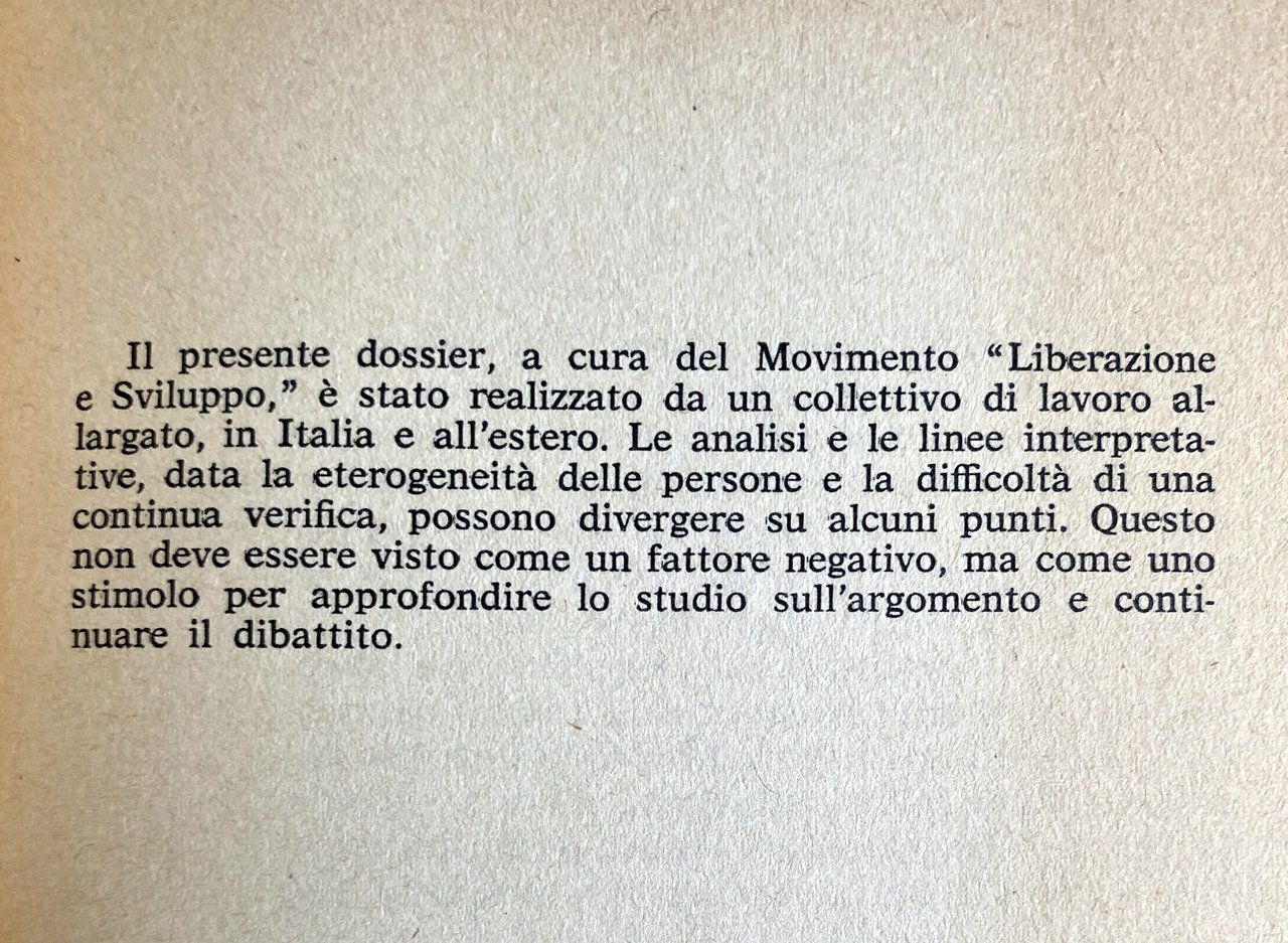 Il presente dossier, a cura del Movimento Liberazione e Sviluppo, è stato realizzato da un collettivo di lavoro allargato, in Italia e all'estero. Le analisi e le linee interpretative, data la eterogeneità delle persone e la difficoltà di una continua verifica, possono divergere su alcuni punti. Questo non deve essere visto come un fattore negativo, ma come uno stimolo per approfondire lo studio sull'argomento e continuare il dibattito.