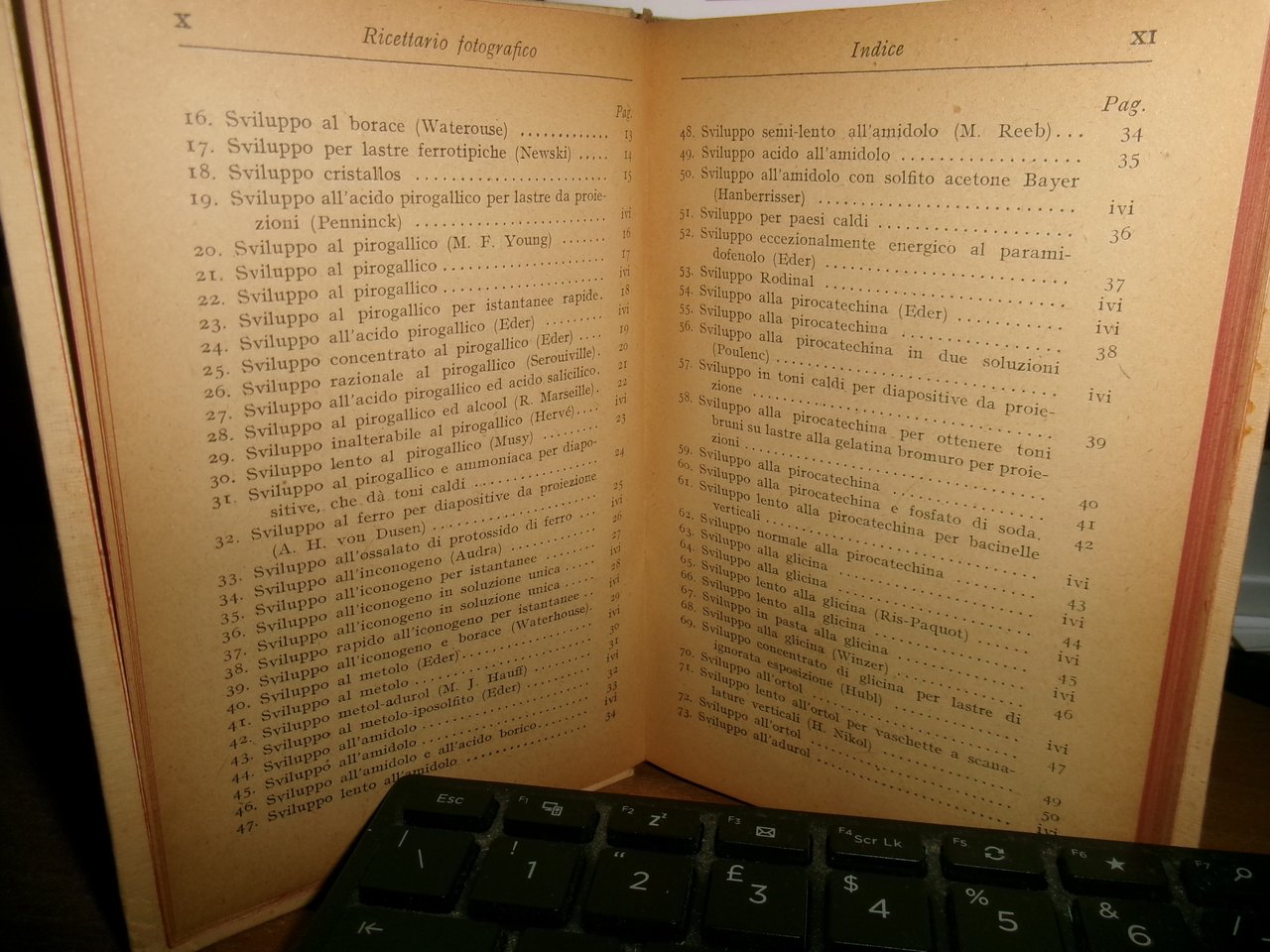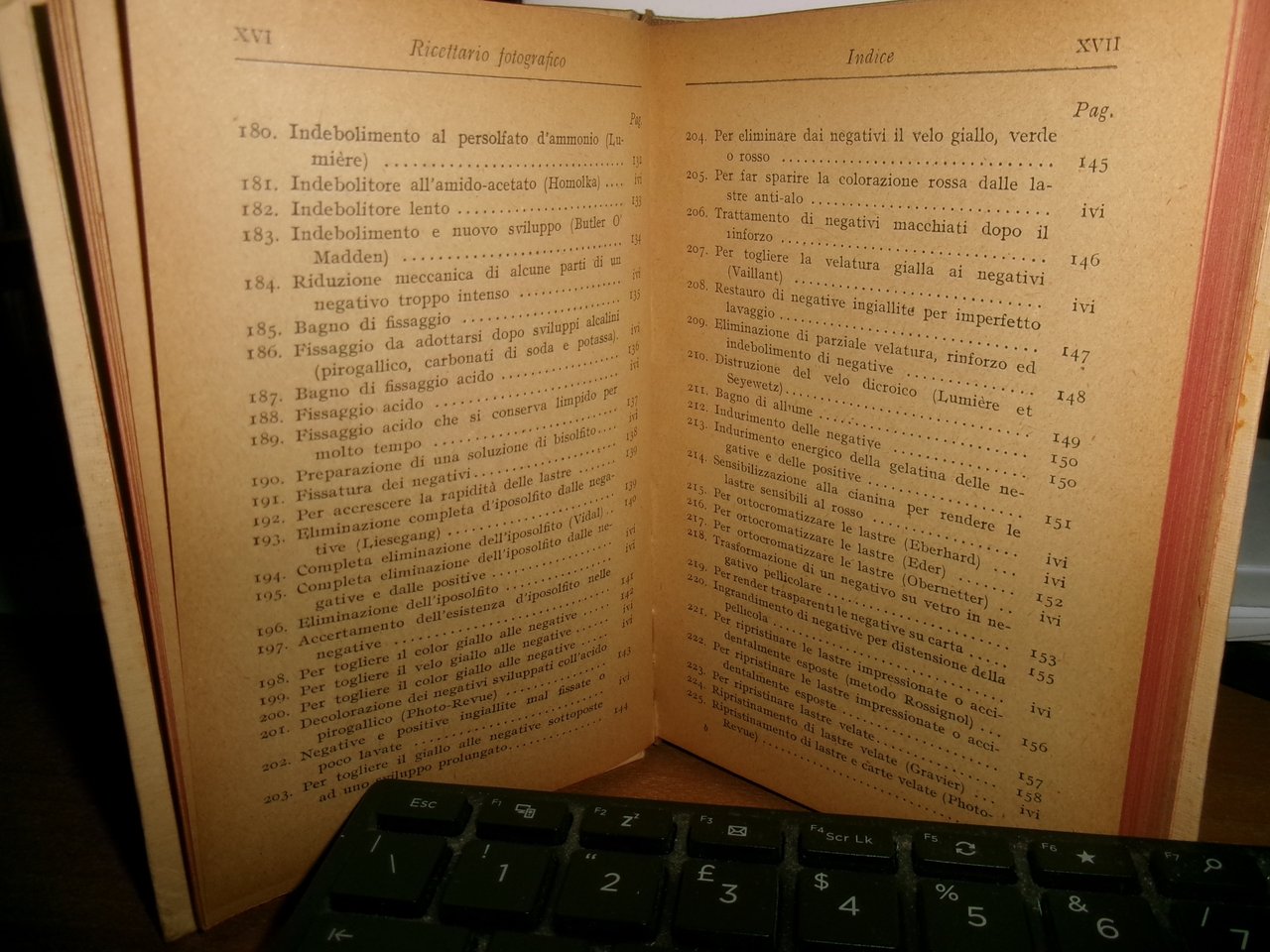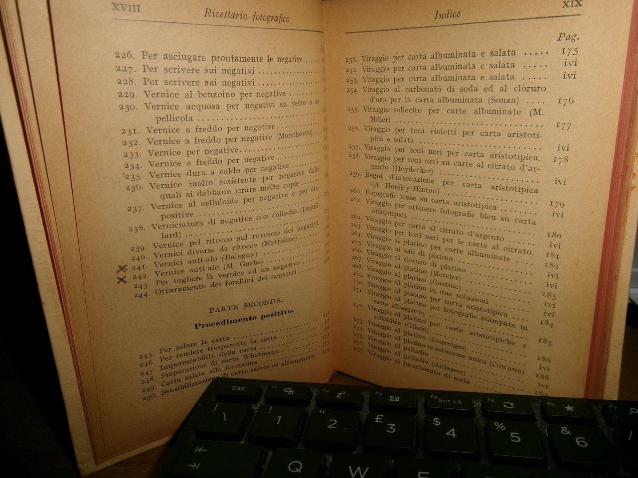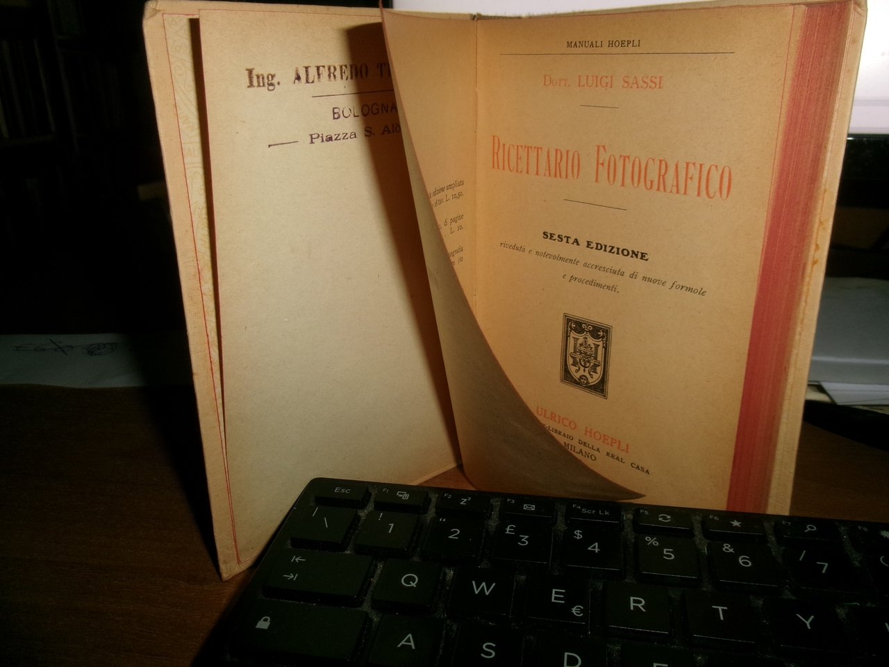 Dott. LUIGI SASSI. Milano, Ulrico Hoepli, 1923. RICETTARIO FOTOGRAFICO. VI edizione riveduta e notevolmente accresciuta di nuove formole e procedimenti. In-16°, tela edit. ill. a col., tagli rossi. xxxi, 399 pp.