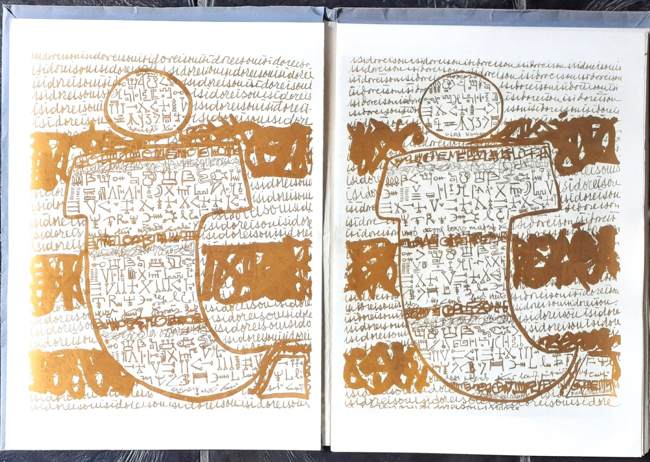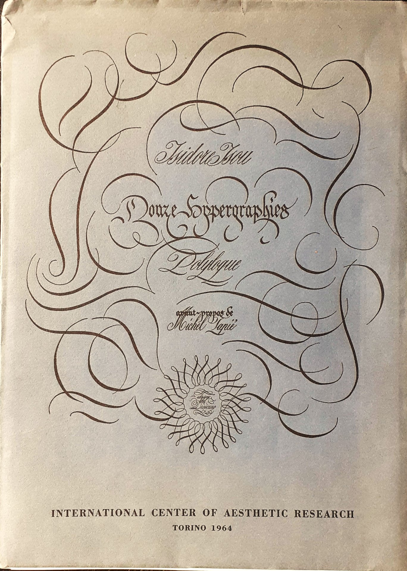 ed. 26 febbraio 1964 con tiratura limitata a 30 esemplari su carta a mano Fabriano nunmerati da 1 a 30 e 170 esemplari su carta Duraflex numerati da 31 a 200 e firmati dall'Autore (esemplare N. 154 con firme autografe di Isodore Isou e Michel Tapié). Testo in francese. IV/ 52 pagine non numerate (13 fogli sciolti piegati a metà, per un totale di 4 facce)/ due fogli bianchi come cartellina e sovraccoperta in carta ruvida grigio-azzurro con grafica in nero di Gio Minola. 12 Hypergraphies in oro e in nero. Stato buono (manca il volantino promozionale inserito dall'Autore). Table des matières: Avant-propos; Michel Tapié (Historique - Contre-critique - Esthetique - Ethique) - Douze Hypergraphies. Polylogue - colophon.