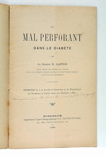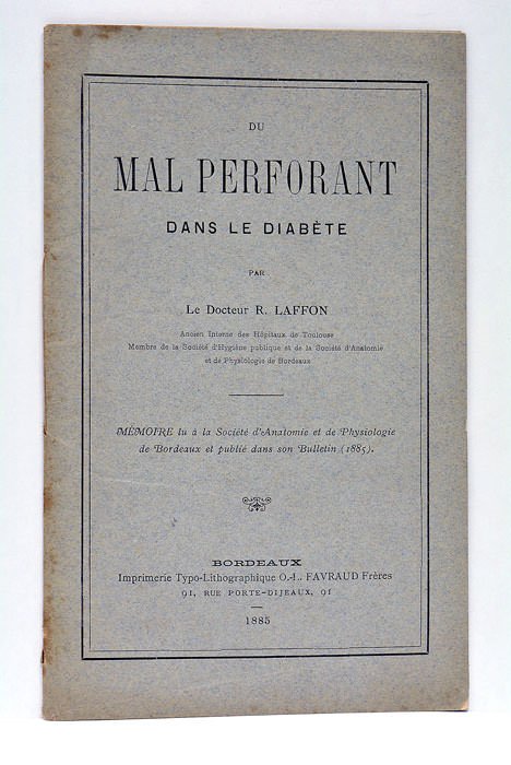 Du mal perforant dans le diabète. Mémoire lu à la Société d'Anatomie et de Physiologie de Bordeaux et publié dans son Bulletin (1885).