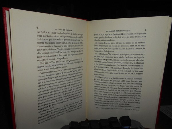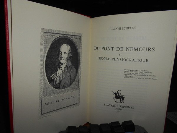 GUSTAVE SCHELLE. Genève, Slatkine Reprints, 1971. DU PONT DE NEMOURS et l'école phisiocratique. Réimpression de l' édition de Paris, 1888. In-8°, tela rossa con titolo in oro al dorso. 456 pp. con ritratto in antiporta. Come nuovo. Uff. B - III - 4 - 2