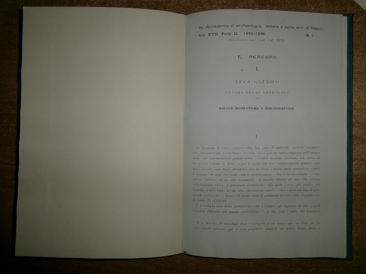 E. PERCOPO I. LUCA GAURICO ultimo degli Astrologi Notizie Biografiche e Bibliografiche. R. Accademia di Archeologia, Lettere e Belle Arti di Napoli. Vol. XVII. Parte II. 1893-1896. In-8°, tela bleu con titolo in oro entro tassello al dorso. 49 pp. poi da pag. 90 a pag. 96. Libro riprodotto come nuovo. Neg. mob. rosso