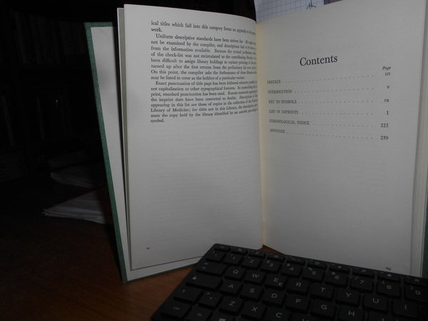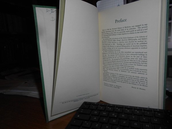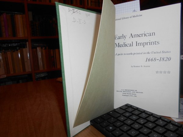 By Robert B. Austin. Washington, U.S. Departement of Health Education, and Welfare, Publie Health Service, 1961. Early American Medical Imprints. A Guide to Works printed in The United States 1668-1820. In-8°, tela verde edit. con titolo in oro entro tassello al dorso, copertine originali conservate. x, 240 pp. Come nuovo in legatura recente con le brossure originali conservate. Uff. D - II - 5