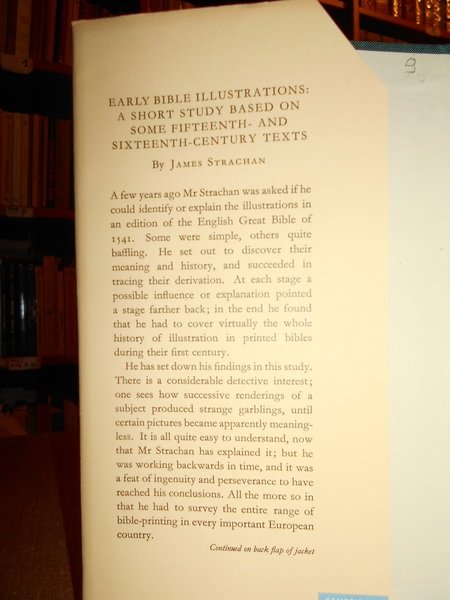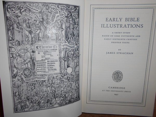 by James, Strachan. Cambridge, At the University Press, 1957. Early Bible Illustrations. A short study based on some fifteenth and early sixteenth century printed text. In-8°, tela verde e oro con sovracopertina. viii, 170 pp. con 126 figure in nero nel testo. Ben conservato. Uff. B - II - 2 - 2