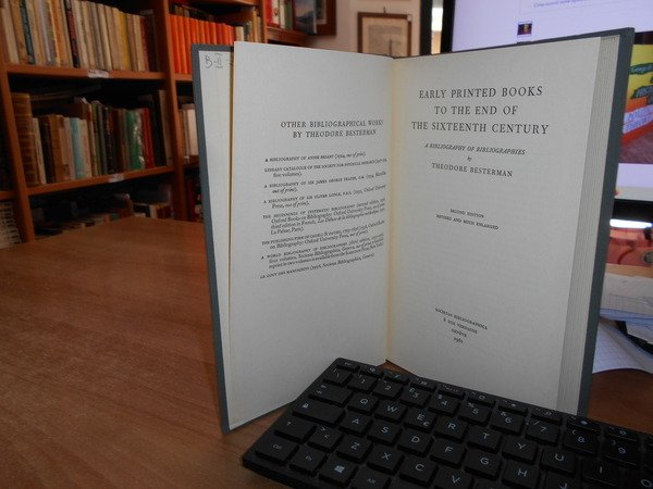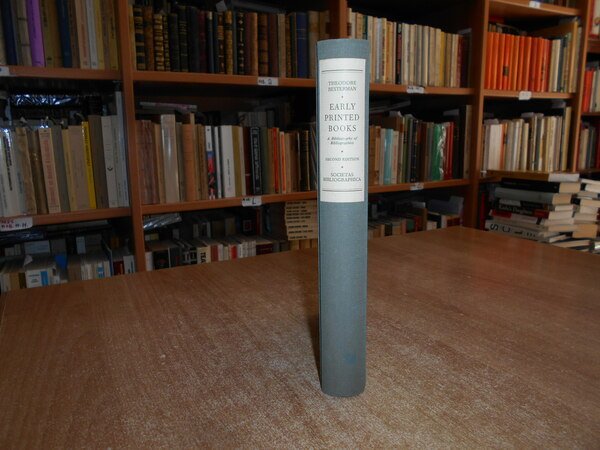THEODORE BESTERMAN. Genève, Societas Bibliographica, 1961. Early Printed Books to the end of the Sixteenth Century. A Bibliography of Bibliographies. Second edition revised and much enlarged. In-8°, tela edit. con titolo al dorso. 344 pp. Ottimo stato. Uff. B - II - 2