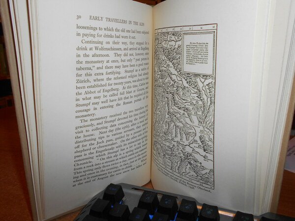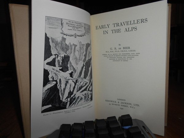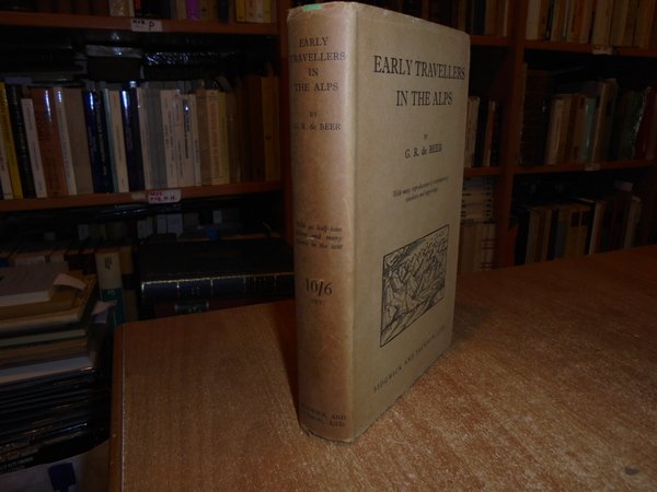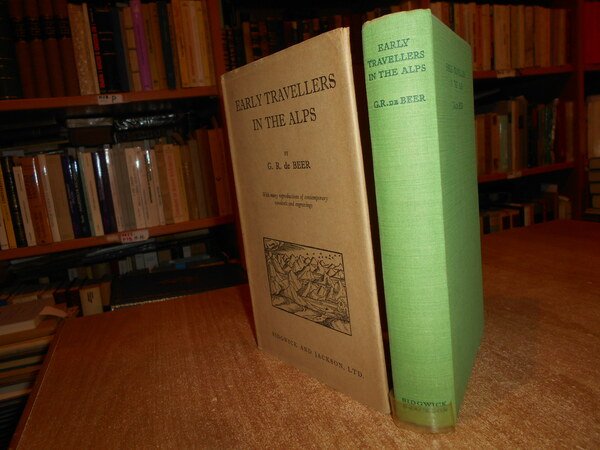 by G.R. de BEER. London, Sidgwick and Jackson, 1930. EARLY TRAVELLERS IN THE ALPS. In-8° , tela verde edit. con titoli, sovracopertina. xx, 204 pp. con illustrazioni n.t e tavole f.t., in fine una cartina più volte ripiegata. Bell' esemplare. La sovracopertina presenta tracce del tempo. Neg. mens. bianca cassa.