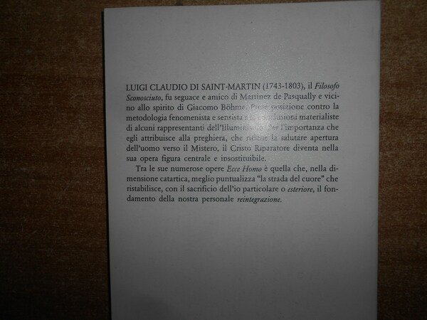 Luigi Claudio di Saint-Martin. Foggia, Bastogi Editore, 1983. ECCE HOMO. La reintegrazione dell' uomo attraverso la catarsi. In-8°, br. 120 pp. Come nuovo. Neg. esot. mob. 10