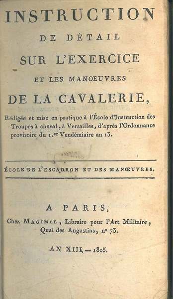 Ecole de l'escadron et des manoeuvres. Fa parte di: Instruction de détail sur l'exercice et les manoeuvres de la cavalerie. Rédigée et mise en pratique à l'ecole d'instruction des troupes à cheval, à Versailles, d'après l'ordonnance provisoire du 1er Ven