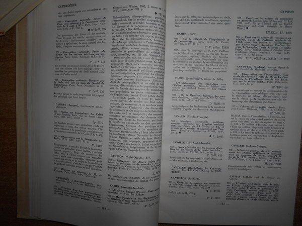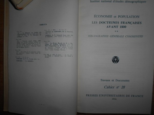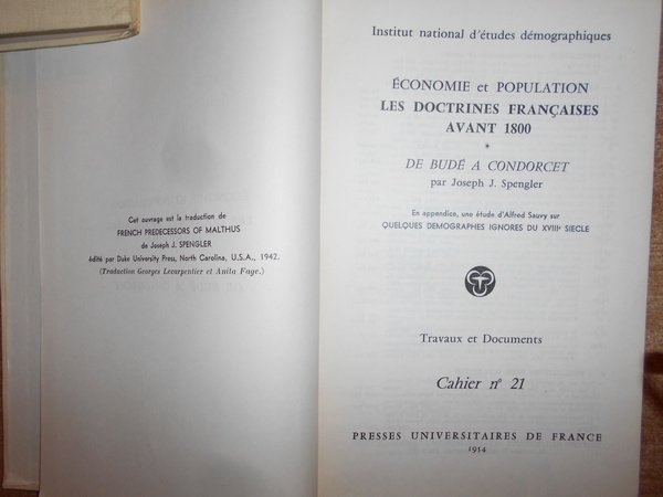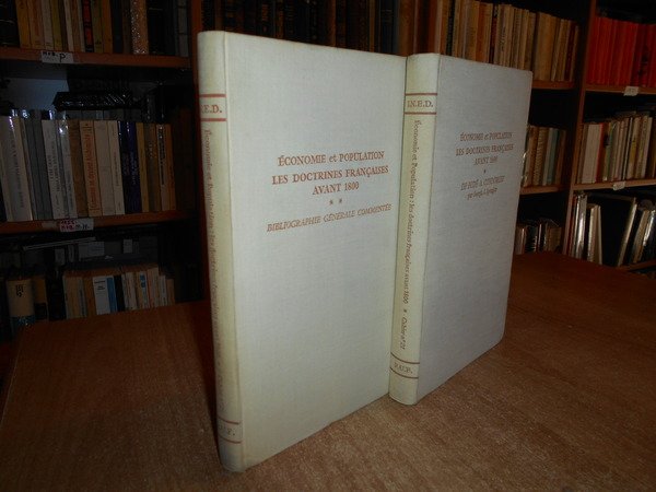 JOSEPH J. SPENGLER. Paris, Presses Universitaires de France, 1954 - 1956. ECONOMIE et Population LES DOCTRINES Françaises avant 1800 de Budé a Condorcet. Bibliographie Générale commentée. 2 volumi in-8°, tela edit. con titoli sui piani e ai dorsi. 389 pp.; xxiii, 689 pp. In ottimo stato di conservazione. Uff. B - III - 4 - 2