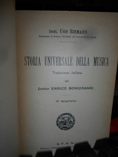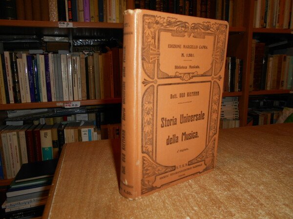 Ugo, Riemann. Torino, Società Tipografico-Editrice Nazionale, 1912. Storia universale della musica. Traduzione italiana del Dottor Enrico Bongioanni. In-16°, tela edit. cop. ornata. viii, 422 pp. con illustrazioni e note nel testo. Ben conservato. Neg. mass. mob. H.H.
