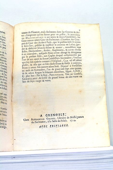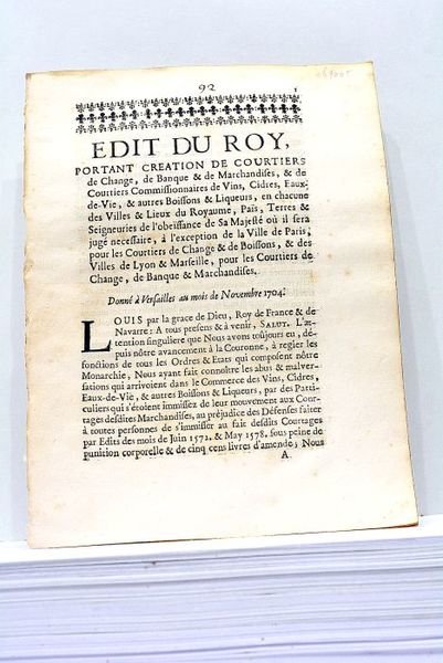 EDIT du Roy, portant creation de Courtiers de Change, de Banque et de Marchandises, et de Courtiers Commissionnaires de Vins, Cidres, Eaux-de-Vie, et autres Boissons et Liqueurs, en chacune des Villes et Lieux du Royaume, Païs, Terres et Seigneuries de l'obeïssance de Sa Majesté où il sera jugé necessaire, à l'exception de la Ville de Paris, pour les Courtiers de Change et de Boissons, et des Villes de Lyon et Marseille, pour les Courtiers de Change, de Banque et Marchandises. Donné à Versailles au mois de Novembre 1704.