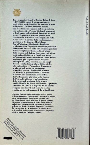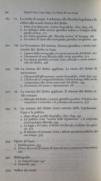 Tra i seguaci di Hegel a Berlino Eduard Gans (1797-1839) è oggi il più conosciuto, e negli ultimi anni gli studi a lui dedicati si sono moltiplicati. Tuttavia, mancava ancora una ricostruzione organica del suo pensiero, che andasse oltre l'esame di singoli argomenti o degli spunti polemici così frequenti nei suoi scritti. E quanto si propone questo libro. L'evoluzione di Gans vi viene seguita in tutto il suo corso, a partire dalla sua formazione giuridica, a Göttingen e Heidelberg, fino all'adesione alla filosofia hegeliana e all'esecuzione di progetti scientifici personali. Particolare rilievo è dato alla proposta gansiana di una completa revisione della struttura della scienza del diritto. Emergono così alcuni tratti originali rispetto a Hegel, ma anche un'insospettata trama sistematica. Sono inoltre analizzate, per la prima volta, le opere principali di Gans, che rivelano, in campi diversi dalla storiografia al diritto civile, alla legislazione - l'intenzione di proporre ai giuristi del tempo un programma scientifico preciso, fondato sull'alleanza tra filosofia e giurisprudenza. Completa il volume una descrizione introduttiva dell'ordinamento giuridico nella Prussia dell'età delle riforme e un'esposizione delle principali tendenze della scienza e della filosofia del diritto nel Vormärz. I problemi affrontati da Gans e le risposte da lui offerte vengono così inseriti nel contesto storico e culturale da cui traggono il loro significato.