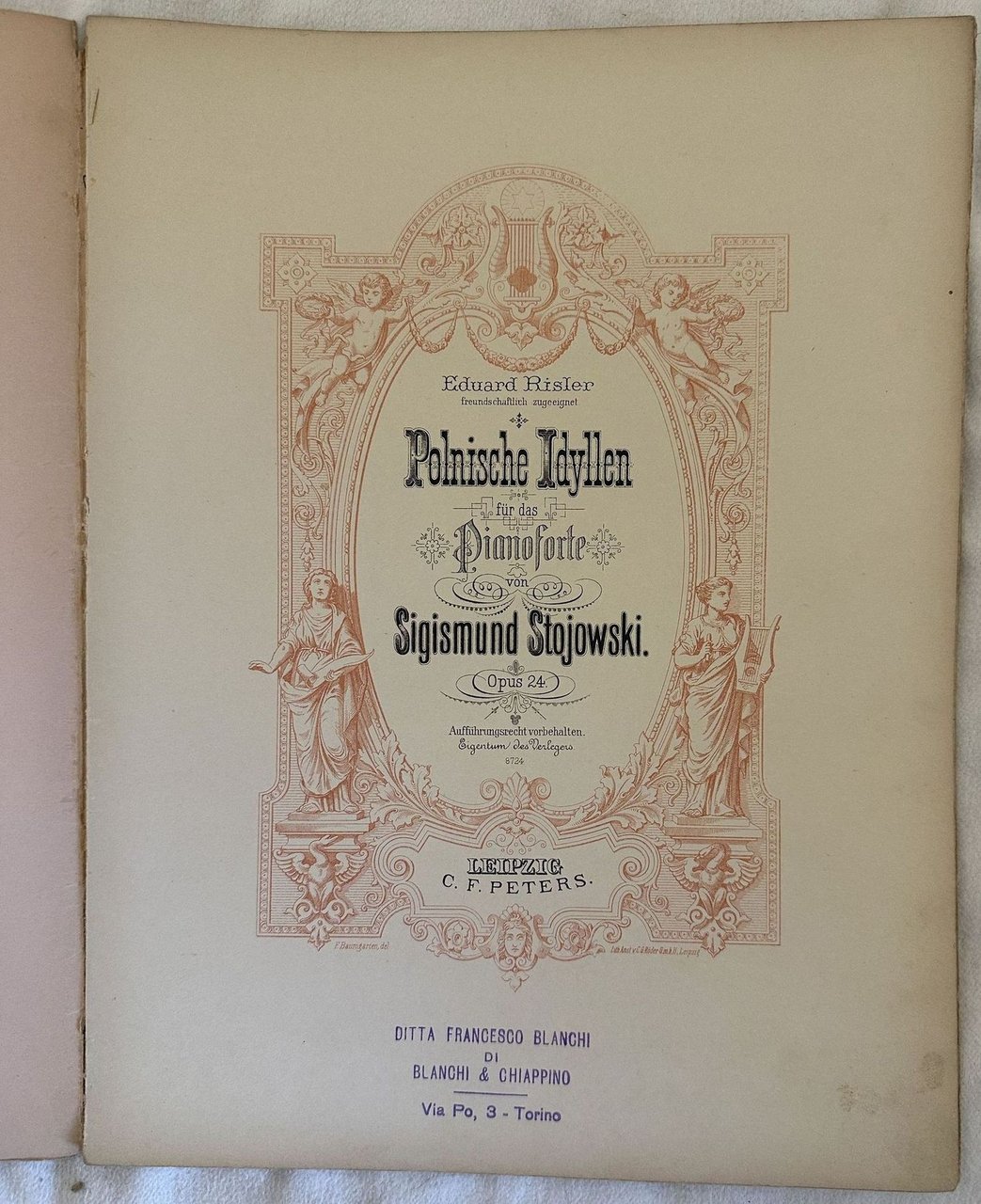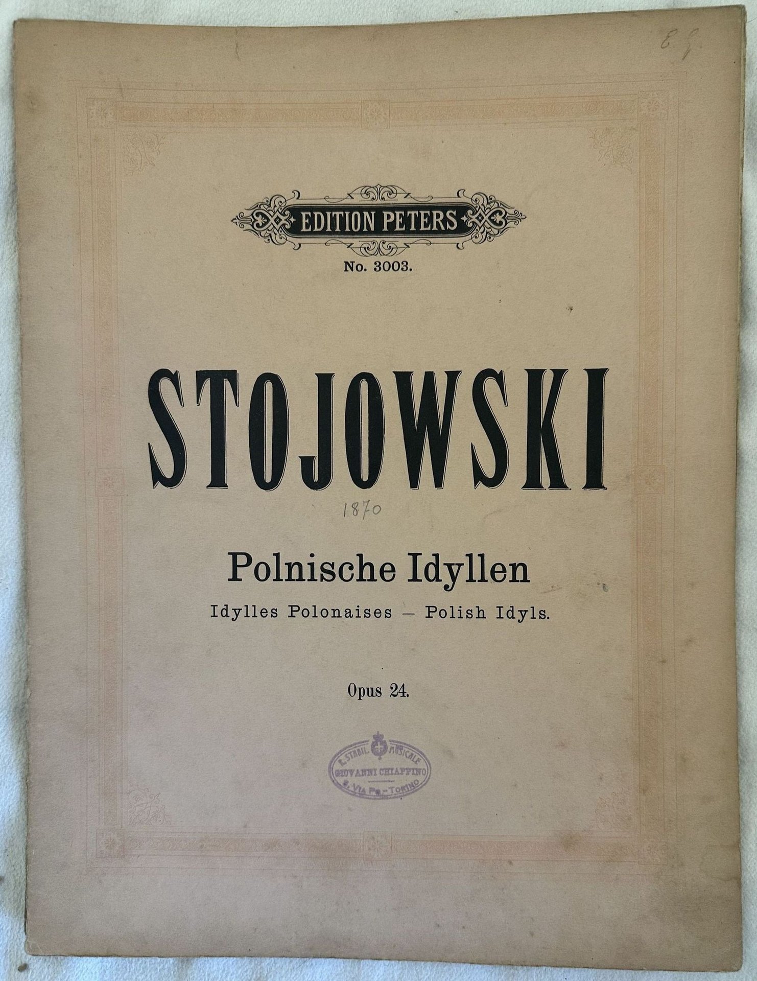 Edizione Peters del 1901 della melodia "Polnische Idyllen" dall'opera 24 del compositore polacco Zygmunt Stojowski (1870-1946). All'interno: Solitude, L'appel des moissonneurs, Coquette de village. Vision de danse, Souvenirs de fete. In buone condizioni. Copertina editoriale in buone condizioni con lievi usure marginali. Legatura quasi assente. Pagine in ottime condizioni con rare fioriture. In Folio. cm. 31x24. Pp. 23.Edition of 1901 of the melody "Polnische Idyllen" from the opera 24 by the polysh composer Zygmunt Stojowski (1870-1946). inside: Solitude, L'appel des moissonneurs, Coquette de village. Vision de danse, Souvenirs de fete. In good conditions. Editorial cover in good conditions lightly worn in the extremities. Binding almost lacks. Pages in very good conditions with occasional foxing. In Folio. cm. 31x24. Pp. 23.