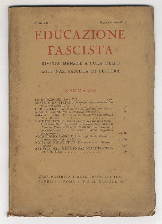 Educazione Fascista. Rassegna mensile pubblicata dall'Istituto Naz. Fascista di cultura. Anno VII. 1929. Di quest'annata disponiamo dei numeri da 1 a 7 e da 9 a 12 (manca il n. 8, agosto).