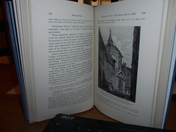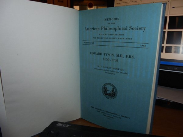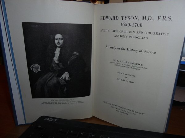 M.F. ASHLEY MONTAGU With a Foreword by GEORGE SARTON. Philadelphia The American Philosophical Society Indipendence Square, 1943. EDWARD TYSON, M.D. F.R.S. 1650-1708 and the rise Human and comparative antatomy in England. A Study in the History of Science. In-8°, tela bleu con titolo in oro entro tassello al dorso, copertine originali conservate. xxix, 488 pp. con una tavola più volte ripiegata f.t. e numerose riproduzioni n.t. Perfetto esemplare in legatura recente con le copertina originali conservate. Uff. C - IV - 6 - 2