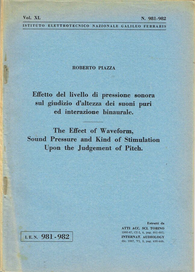 Effetto del livello di pressione sonora sul giudizio d'altezza dei suoni puri ed interazione binaurale - The Effect of Waveform, Sound Pressure and Kind of Stimulation Upon the Judgement of Pitch | Libri antichi e moderni | Roberto Piazza