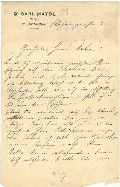 2 SS. 8vo. Ersucht den Adressaten ihm ein kurzes Curriculum Vitae und eine Liste seiner Publikationen zukommen zu lassen, um ihn f r die vakante Stelle in der chirurgischen Abteilung vorschlagen zu k nnen. - Auf Briefpapier mit gedr. Briefkopf und aufgeklebtem Aufgabeschein.