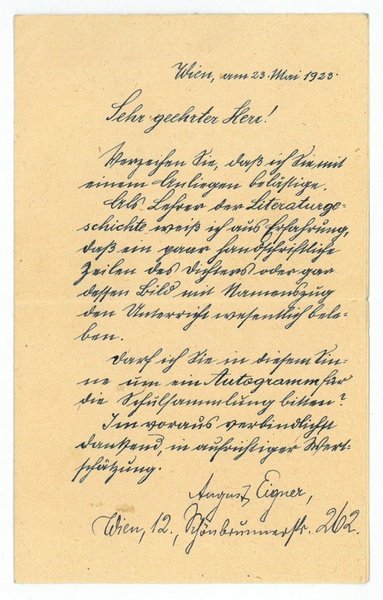 1 S. auf Doppelblatt. 8vo. An einen namentlich nicht genannten Adressaten: "Verzeihen Sie, daß ich Sie mit einem Anliegen belästige. Als Lehrer der Literaturgeschichte weiß ich aus Erfahrung, daß ein paar handschriftliche Zeilen des Dichters oder gar dessen Bild mit Namenszug den Unterricht wesentlich beleben [.]". - August Eigner war Leiter des Meidlinger Heimatmuseums und arbeitete seit 1945 im Wiener Amt für Kultur und Volksbildung. "Er trat als Lyriker ('In Stunden der Andacht', 1922), Verfasser von Sagenbüchern (u. a. 'Poetisches Sagenkränzlein aus Salzburg', 1925) sowie als Komponist und Heimatforscher hervor" (DBE).
